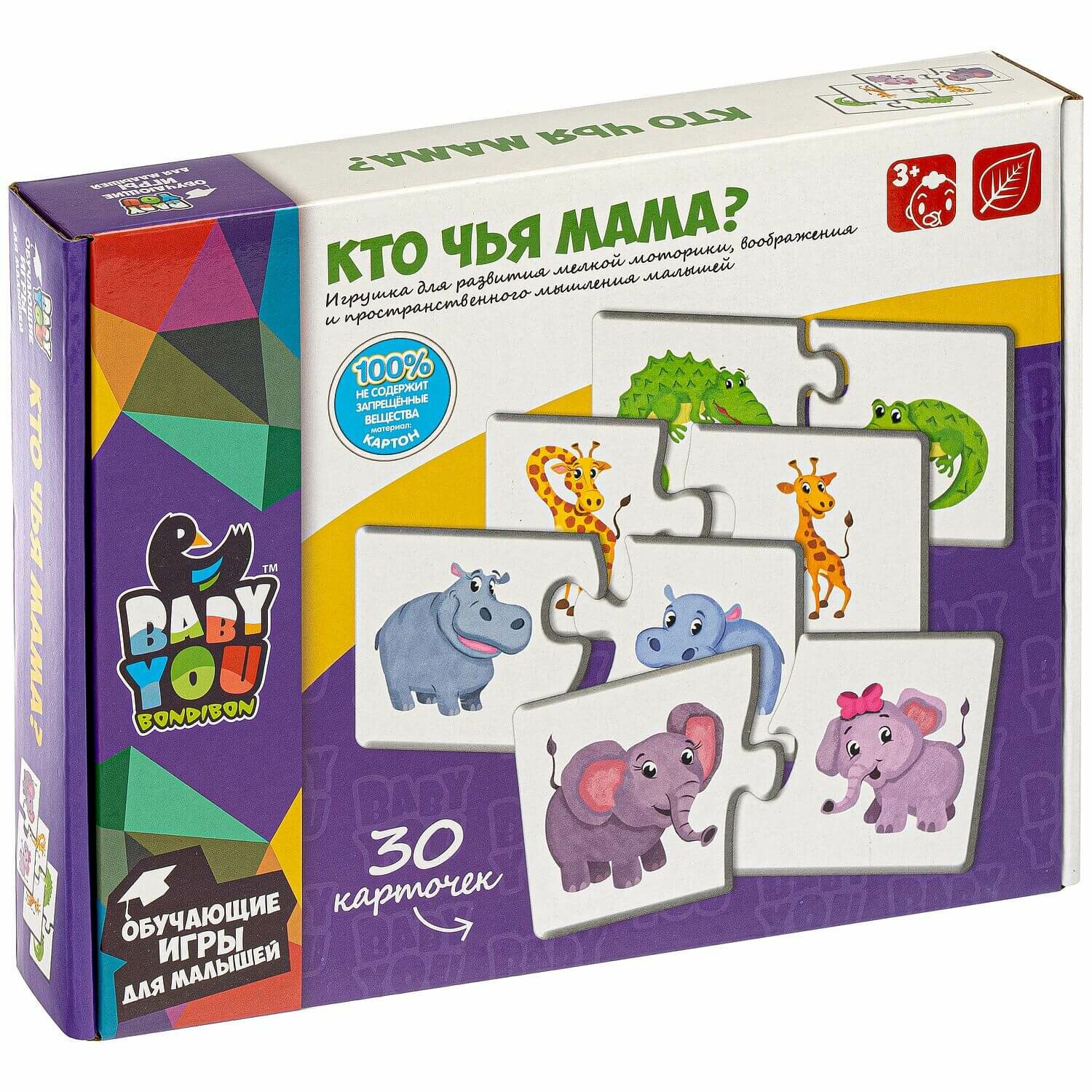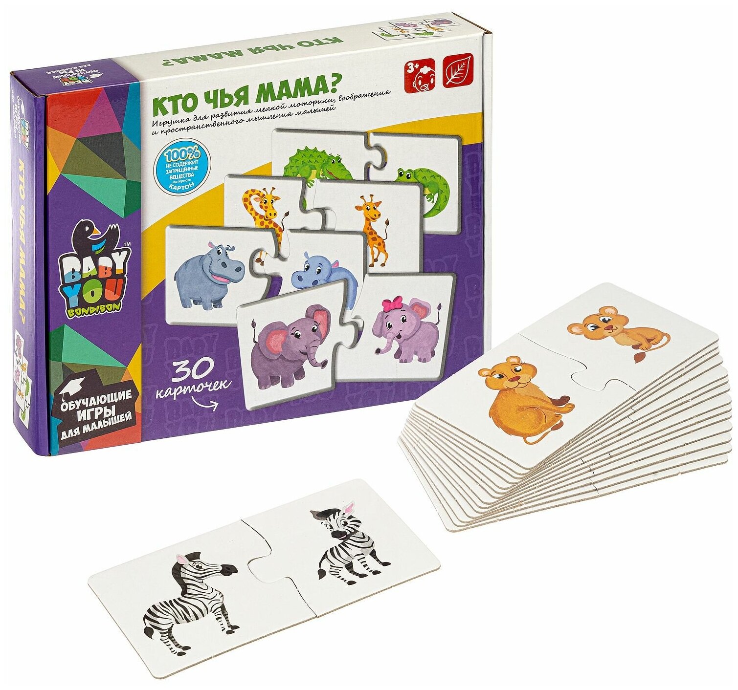 Набор карточек-пазлов "КТО ЧЬЯ МАМА?" Baby You Bondibon предназначен для детей от 3-х лет и поможет в развитии ассоциативного мышления и способностей устанавливать логические связи. Состоит из двух частей. Ребенку необходимо правильно подобрав соответствующую пару в 15 смысловых группах. Способствует в развитии логического мышления, внимания, речи, памяти, воображения и мелкой моторики.