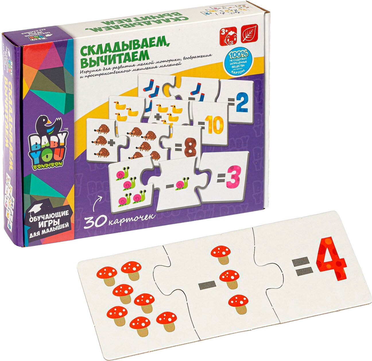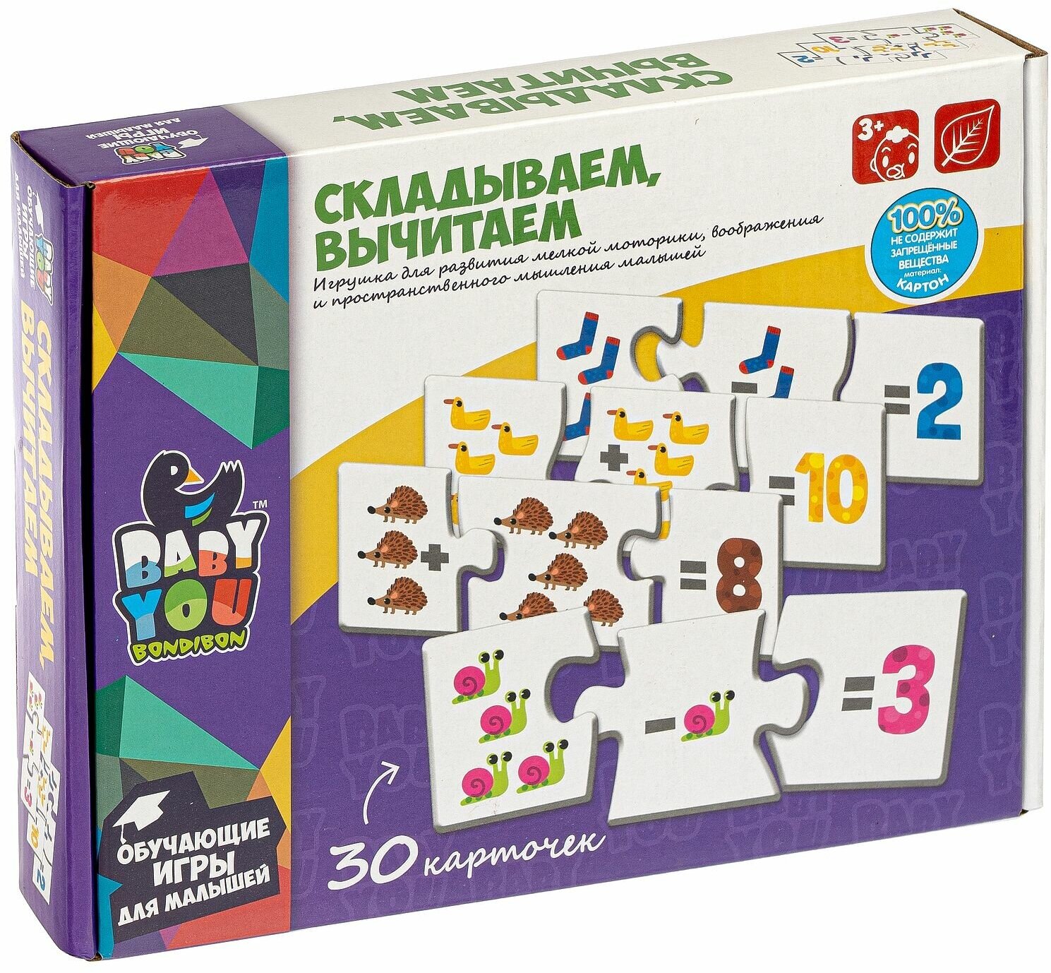 Набор карточек-пазлов "СКЛАДЫВАЕМ, ВЫЧИТАЕМ" Baby You Bondibon предназначен для детей от 3-х лет и поможет в изучении основ сложения и вычитания. Состоит из трех частей, две из которых показывают количество предметов для сложения или вычитания, третья - число-результат решения примера. Ребенку необходимо верно собрать все части, правильно подобрав соответствующие карточки в 10 смысловых группах. Способствует в развитии навыков сложения и вычитания, логического мышления, внимания, речи, памяти, воображения и мелкой моторики.