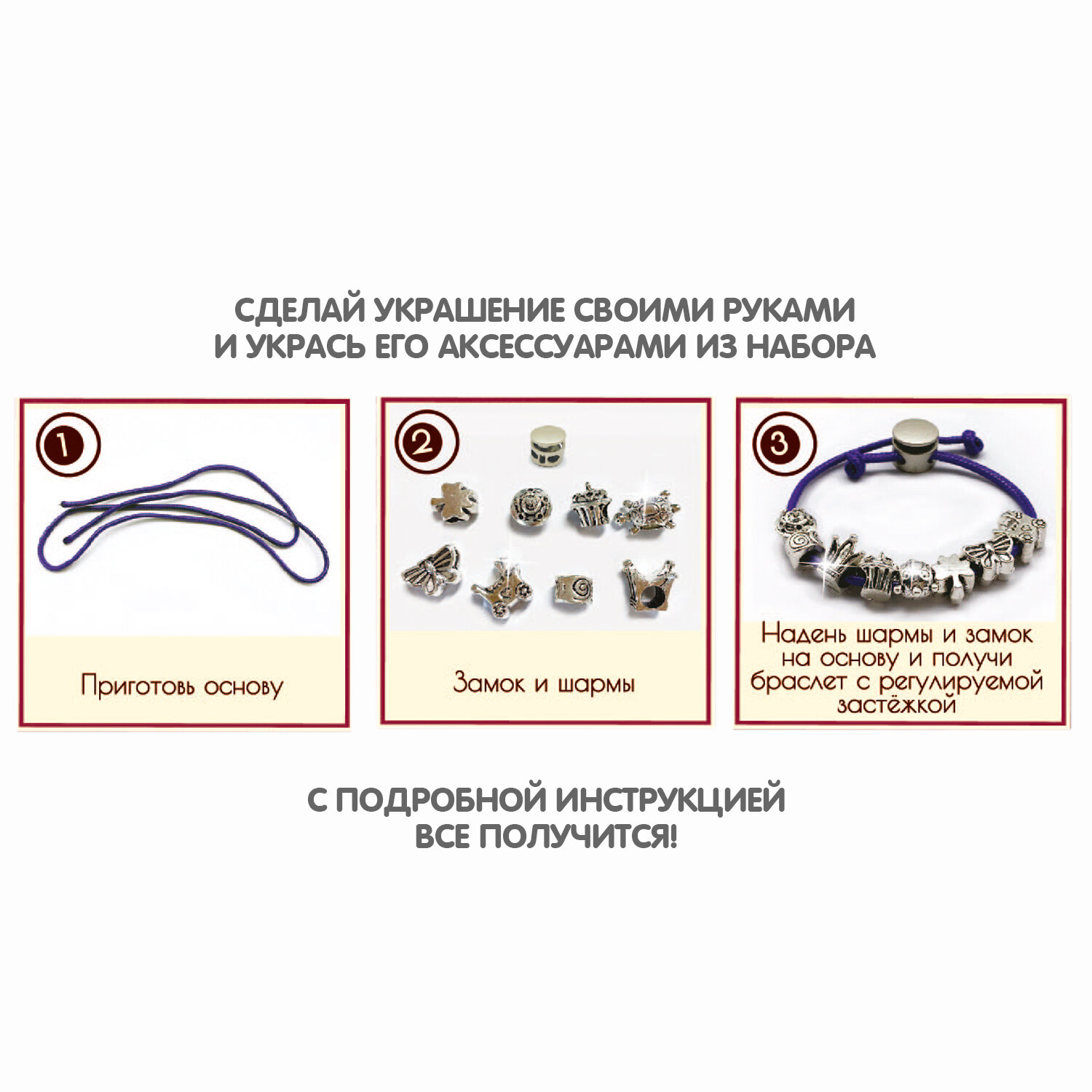 Приготовь все компоненты набора, отрежь от шнура отрезок сантиметров на 12 -15 больше, чем обхват запястья. Надень на полученную основу шармы и замок, на концах шнура завяжи узелки, что бы он не распускался. Твой браслет готов!