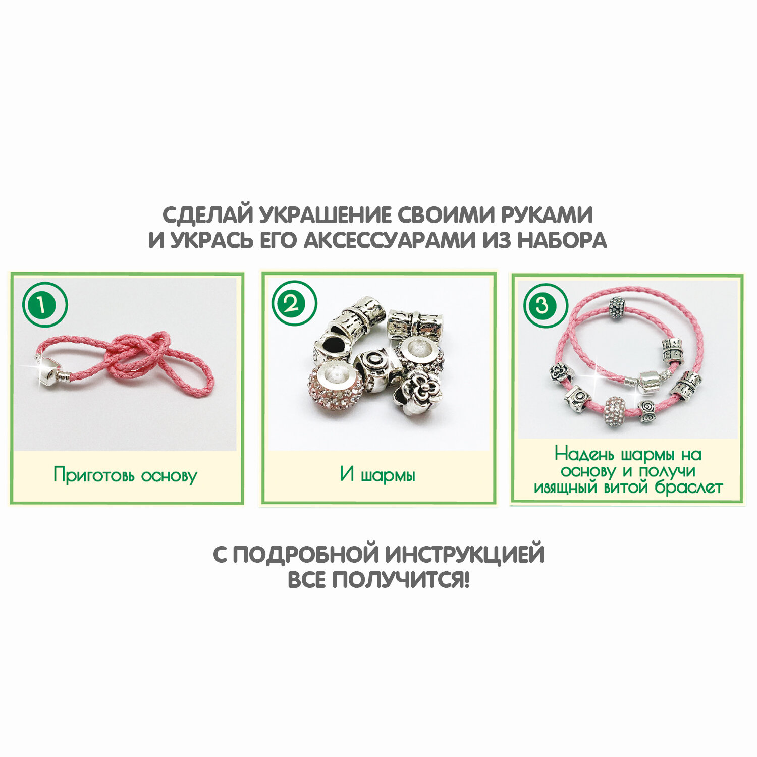 Приготовь все компоненты набора и создай оригинальный витой браслет с шармами. Надень шармы на готовую основу браслета. На основе уже есть замок. Надень браслет на руку и зафиксируй его.