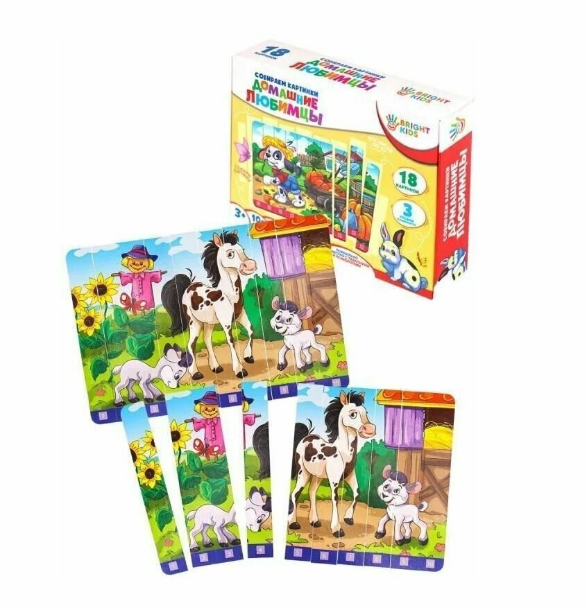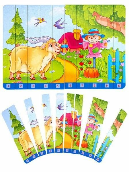 В наборе 18 красочных картинок, разделённых на 10 вертикальных полосок, каждая из которых обозначена цветом, цифрой и значком уровня сложности (3 уровня сложности).