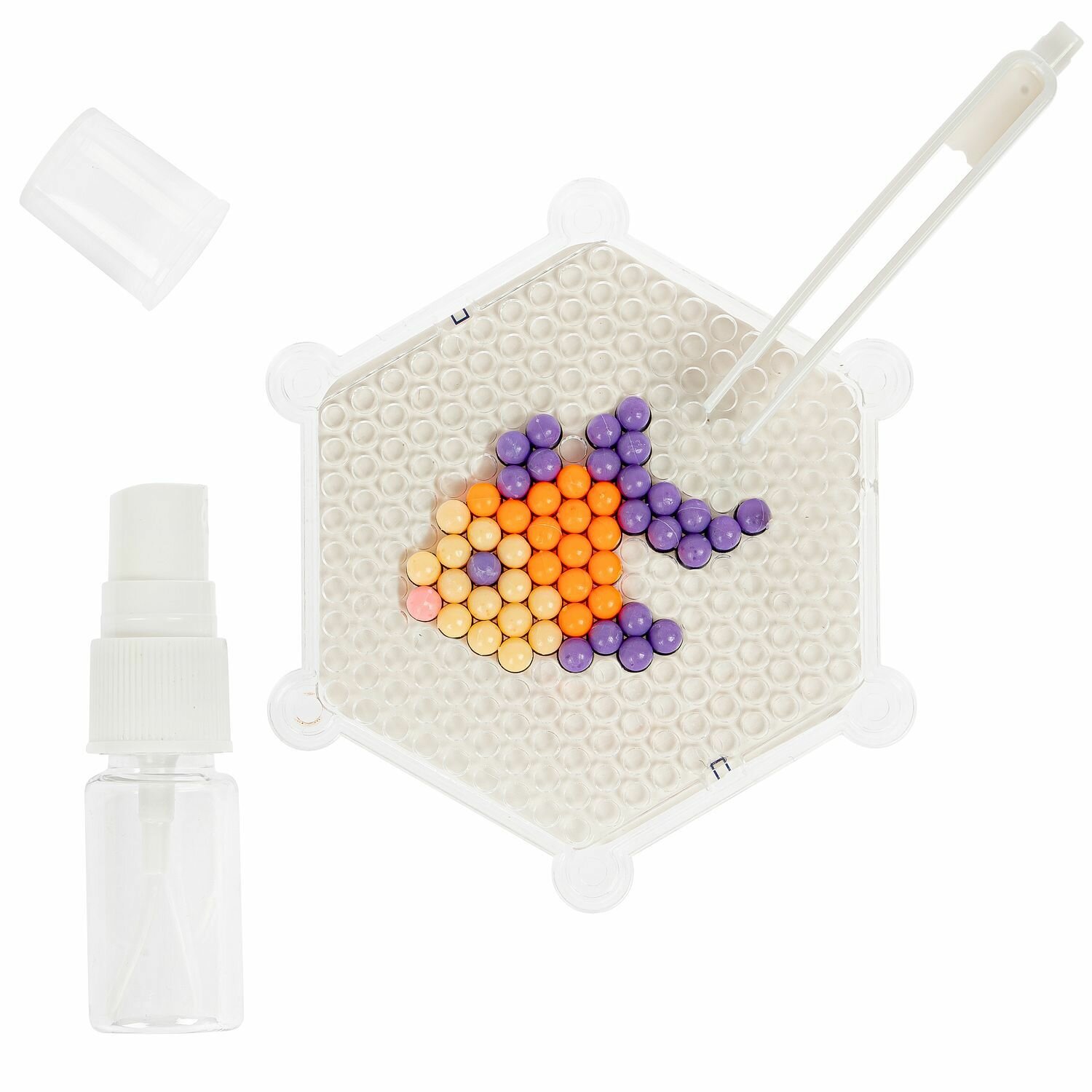 Разложите цветные шарики по трафарету, слегка смочите их водой, дайте им высохнуть и готовая фигурка из нежных бусин застынет!