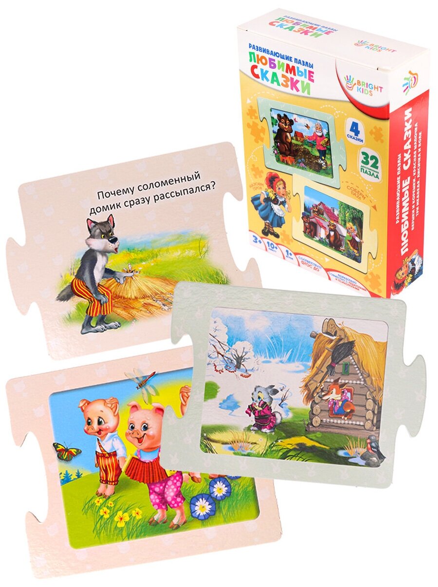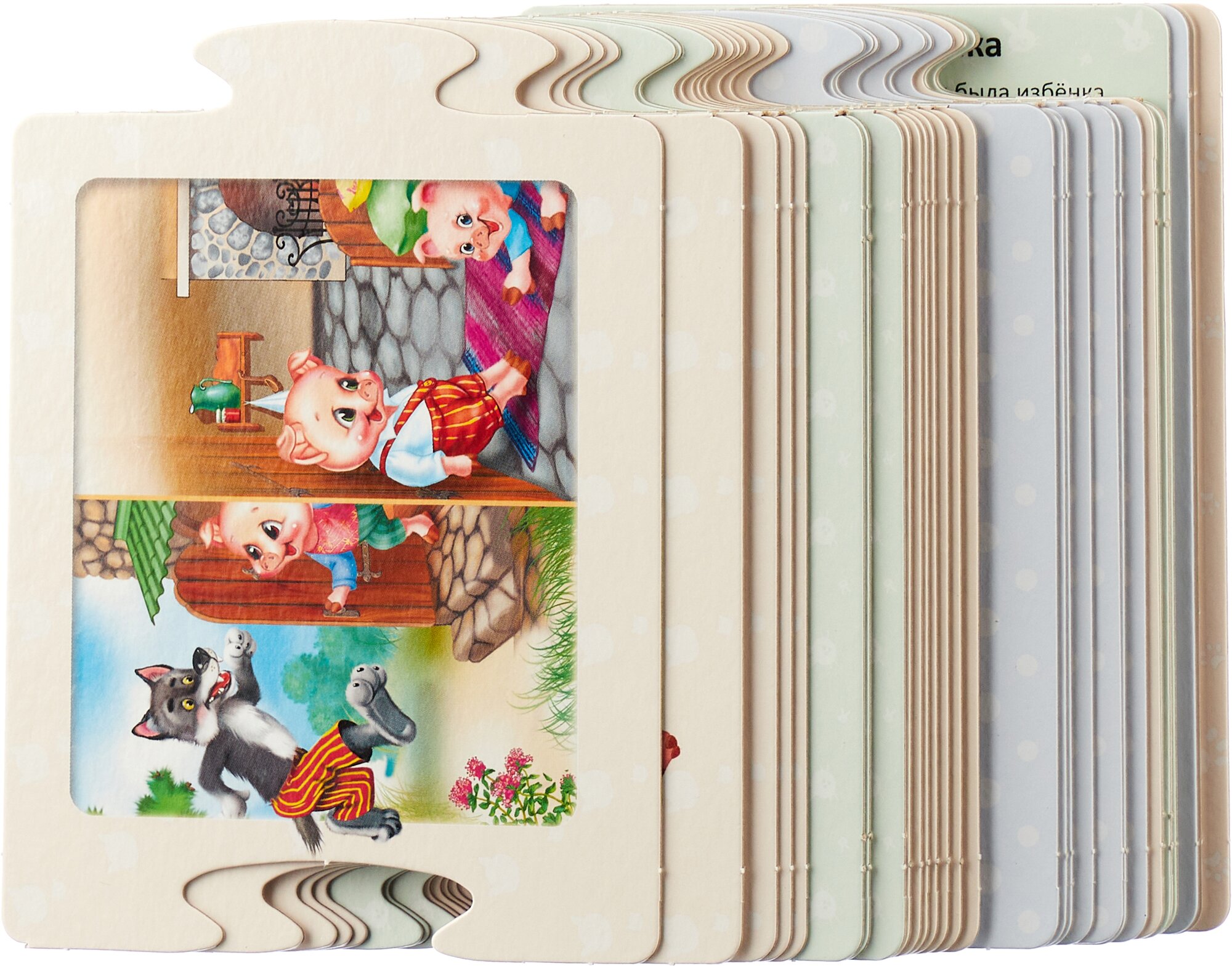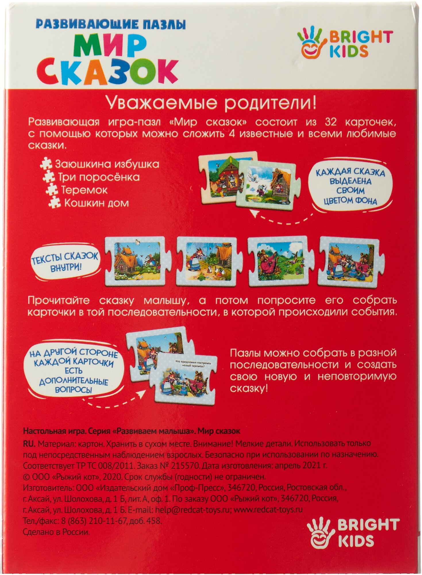 Разваваюшая игра-пазл "Мир сказок" состоит из 32 карточек, с помошью которых можно сложить 4 известные и всеми любимые сказки (Заюшкина избушка. Три поросенка. Теремок. Кошкин дом). Прочитайте сказку малышу, а потом попросите его собрать карточки в той последовательности, в которой происходили события.