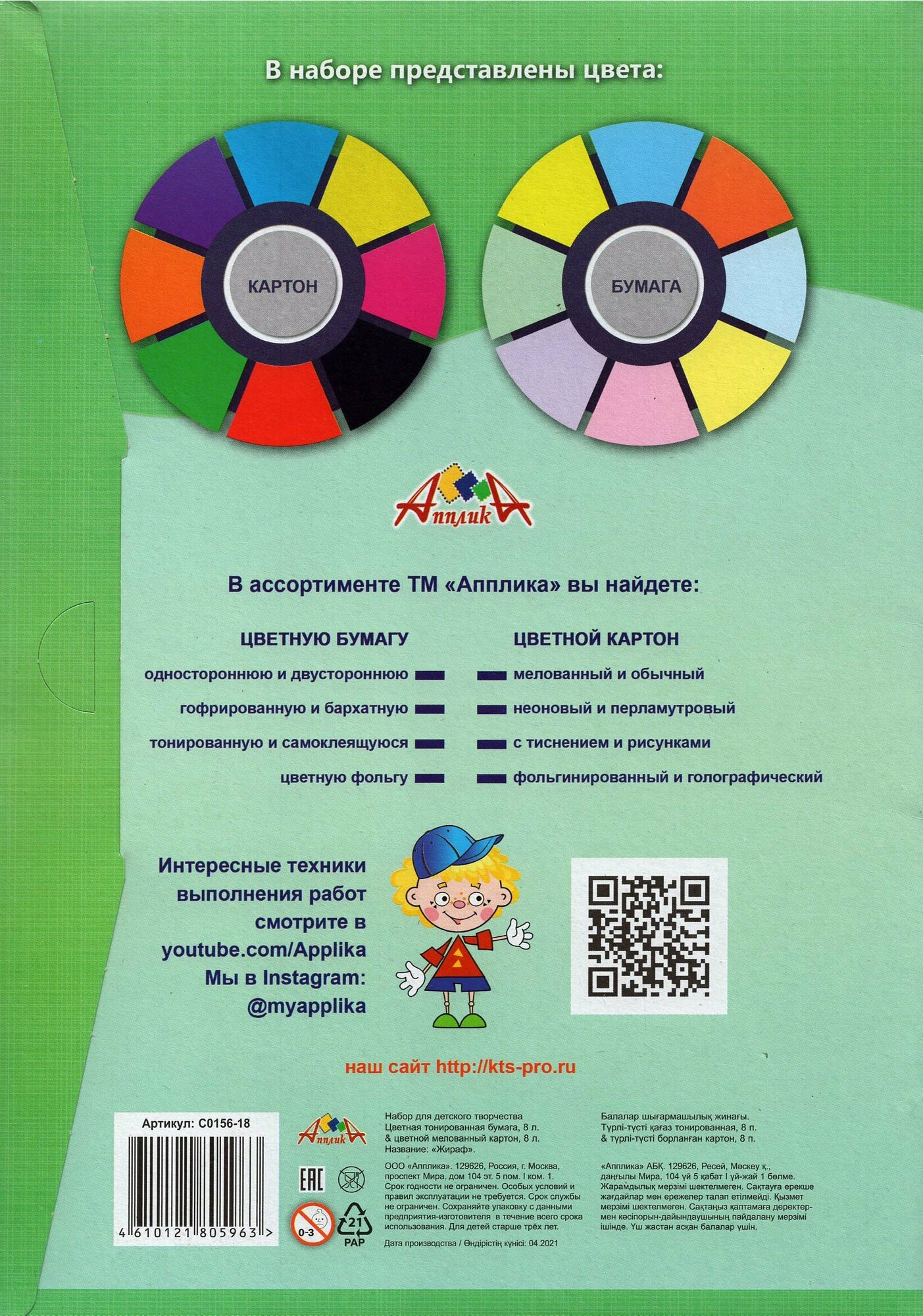 Набор цветного мелованного картона 8 листов, 8 цветов и цветной тонированной бумаги 8 листов, 8 цветов. Формат А4. Внутренний блок изготовлен из мелованного картона, плотность 230 гр/м2 и тонированной (крашеной в массе) бумаги. В наборе цвета картона: красный, синий, зеленый, желтый, оранжевый, розовый, фиолетовый, черный, и цвета бумаги: синий, желтый, красный, розовый, оранжевый, светло-зеленый, песочный, голубой. Упаковка - папка с 3-мя клапанами выполнена из мелованного картона.
