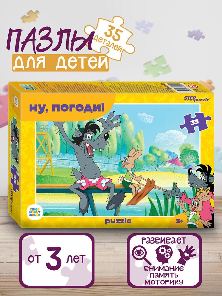 Пазл «Ну, погоди!» состоит из 35 деталей. Картинка пазла показывает нам теплый летний день — Заяц тут готовится кататься на водных лыжах.