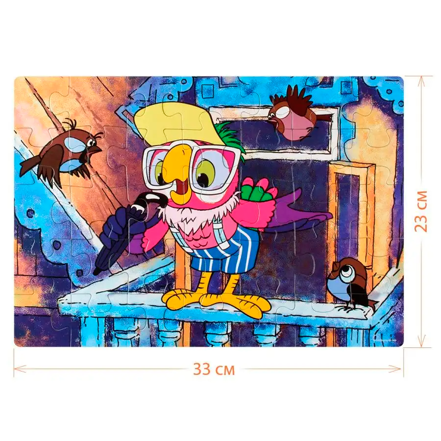 Пазл «Попугай Кеша» состоит из 35 деталей. Его картинка повторяет сцену из любимого многими мультфильма: ту, где Кеша выступает в роли ведущего. Правда, вместо микрофона он вынужден говорить в зонтик, но его самого этого нисколько не смущает.