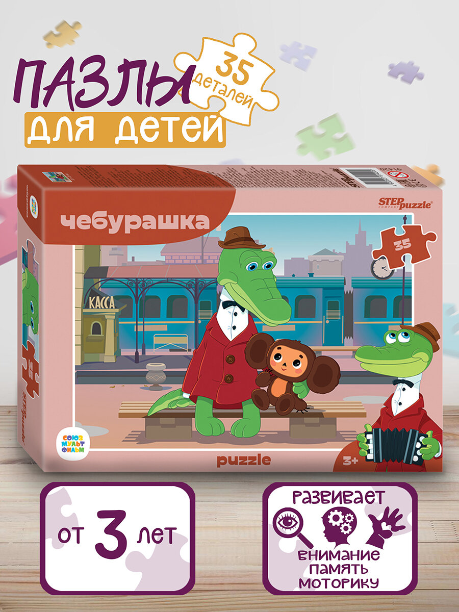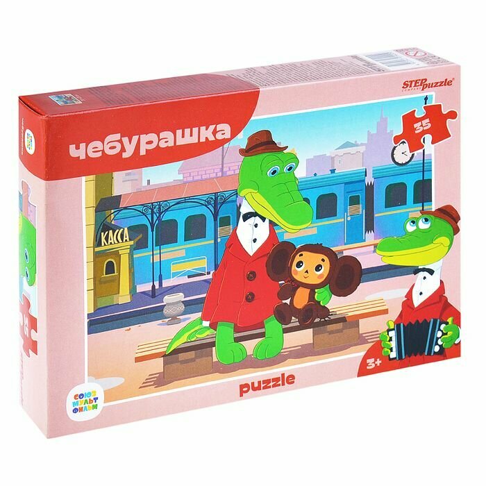 Пазл «Чебурашка» состоит из 35 деталей. Его картинка показывает нам сцену на вокзале: Чебурашка и Гена сидят на скамеечке и, видимо, ждут отправления своего поезда.