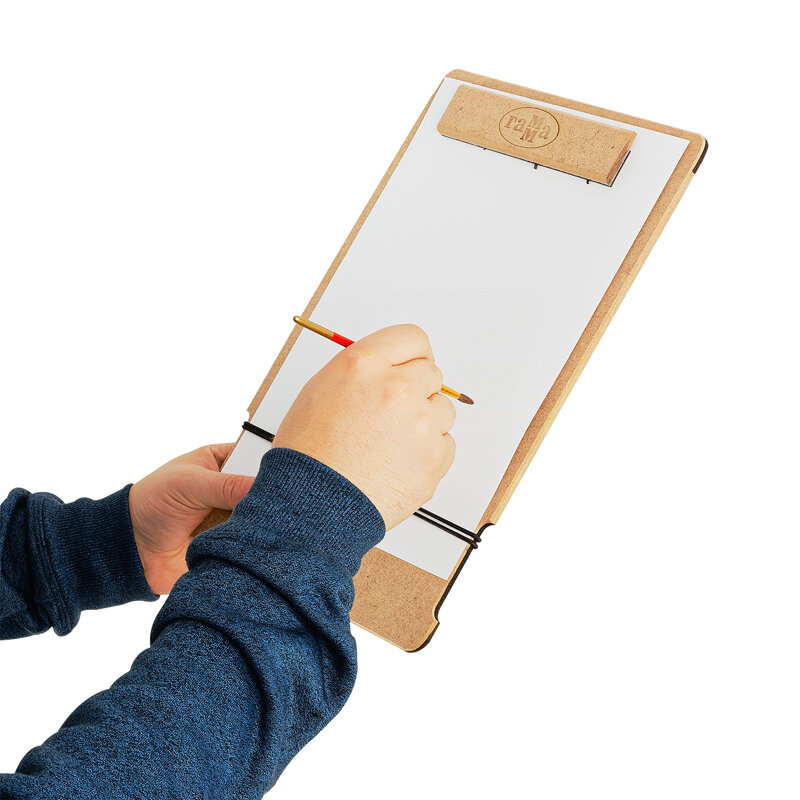 Планшет-клипборд для живописи на пленэрах и вне студии — лёгкий, тонкий, но прочный. Магнитный зажим и резинка надёжно фиксируют лист, не оставляя заломов. Гладкая поверхность не повреждает даже тонкую бумагу. Держатели для карандашей и отверстия для кистей позволяют организовать рабочее место — нужные инструменты под рукой. Планшет можно установить на мольберт-треногу или этюдник.