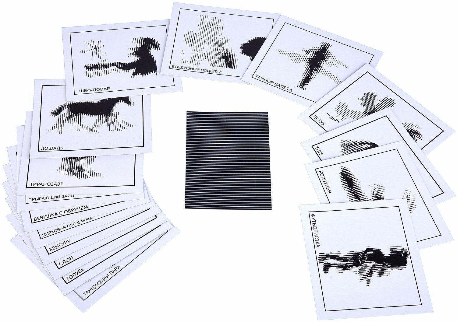 Положите плёнку на карточку с картинкой. Затем слегка подвигайте плёнку влево и вправо. Картинка оживёт. В комплекте набора Механическая анимация 16 разнообразных карточек. На упаковке находится отверстие, с помощью которого вы сможете протестировать игру, не открывая упаковки.