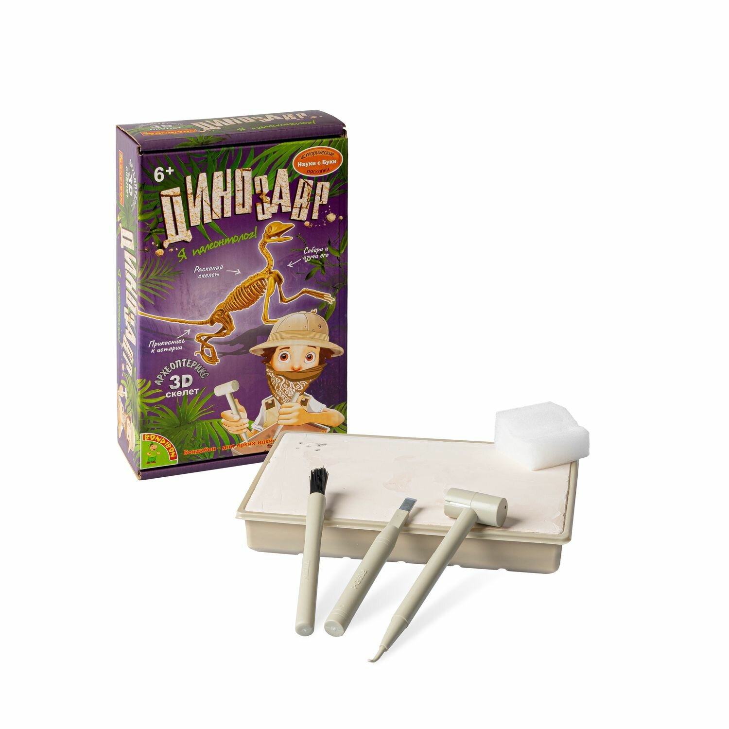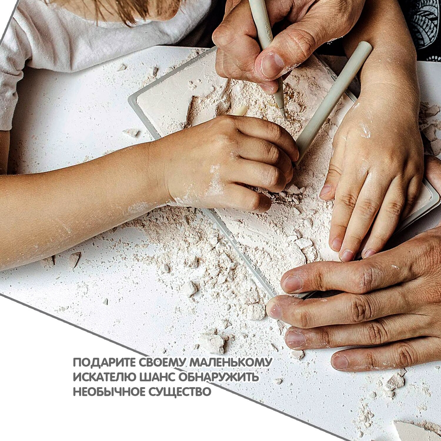 Состав набора: блок для проведения раскопок, молоток, зубило, кисточка, губка, скелет, инструкция.