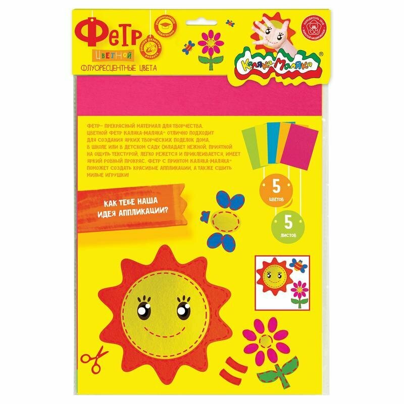 Фетр цветной флюоресцентный 5 цветов в пакете (ФФКМ05) Каляка-Маляка