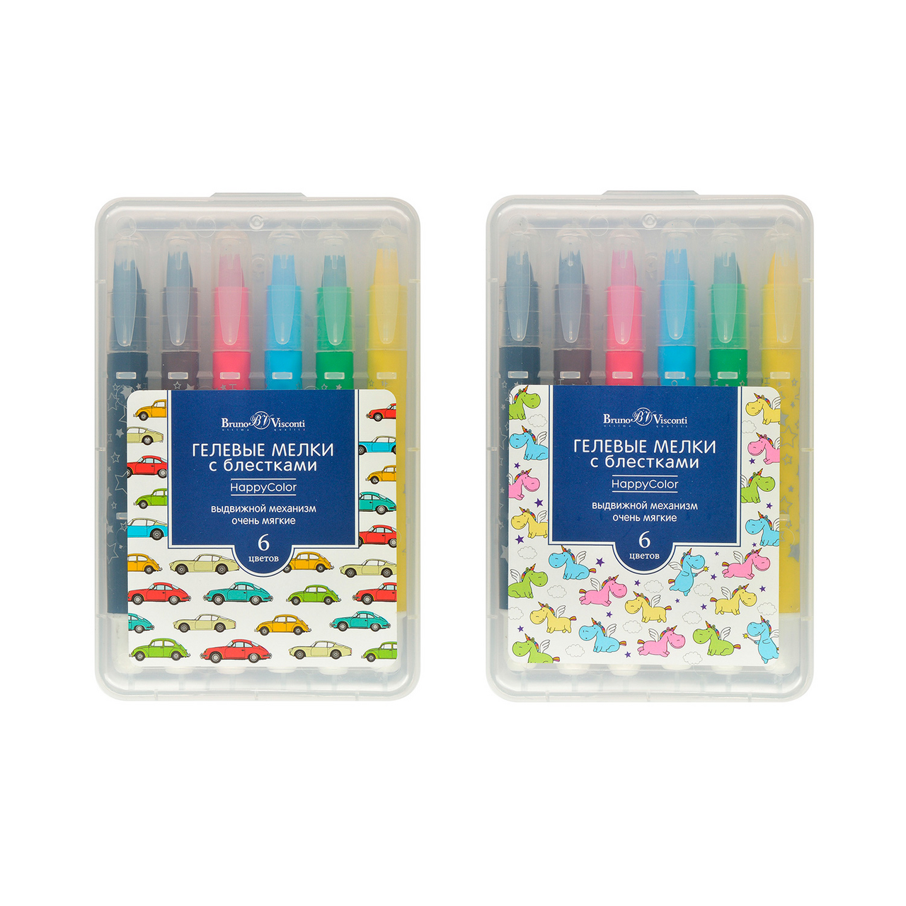 Мелки гелевые с блестками, 6 цветов. Для детского творчества и оформительских работ. Особая технология с применением глицерина, использующаяся при производстве мелков, обеспечивает легкое, плавное и мягкое скольжение по поверхности. Выдвижной механизм позволяет контролировать расход грифеля, защищает от поломки, а также не пачкает руки. Защитный, плотно защелкивающийся колпачок предотвращает грифель от высыхания. Яркие, насыщенные и контрастные цвета легко смешиваются друг с другом и размываются мокрой кисточкой. Мелками можно рисовать на белой, цветной или черной бумаге, картоне, стекле, пластике. Легко смываются водой и отстирываются с одежды. Нетоксичны, безопасны для детей. Длина корпуса 133 мм, толщина грифеля 8 мм.