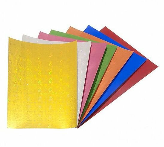 Переливающийся космический звездный узор голографической цветной ламинированной (металлик) бумаги вдохновит ребенка на создание оригинальных и эффектных поделок. Можно красиво совместить ее с обычной цветной бумагой в аппликациях, сочетать фигурки из ламинированной (металлик) бумаги с детским рисунком, украсить подарок или объемную поделку вырезанными из нее блестящими декоративными элементами.
