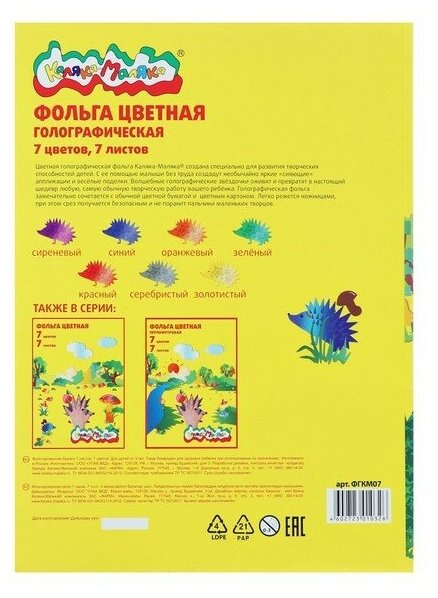 Любые поделки с ее использованием получаются нарядными и выглядят волшебно. Голографическая ламинированная (металлик) бумага не имеет острых краев и поэтому безопасна для ребенка! Сгибая, разрезая, наклеивая, ребенок развивает мелкую моторику рук, координацию, знакомится с цветом. Яркий дизайн упаковки мотивирует к занятиям творчеством!