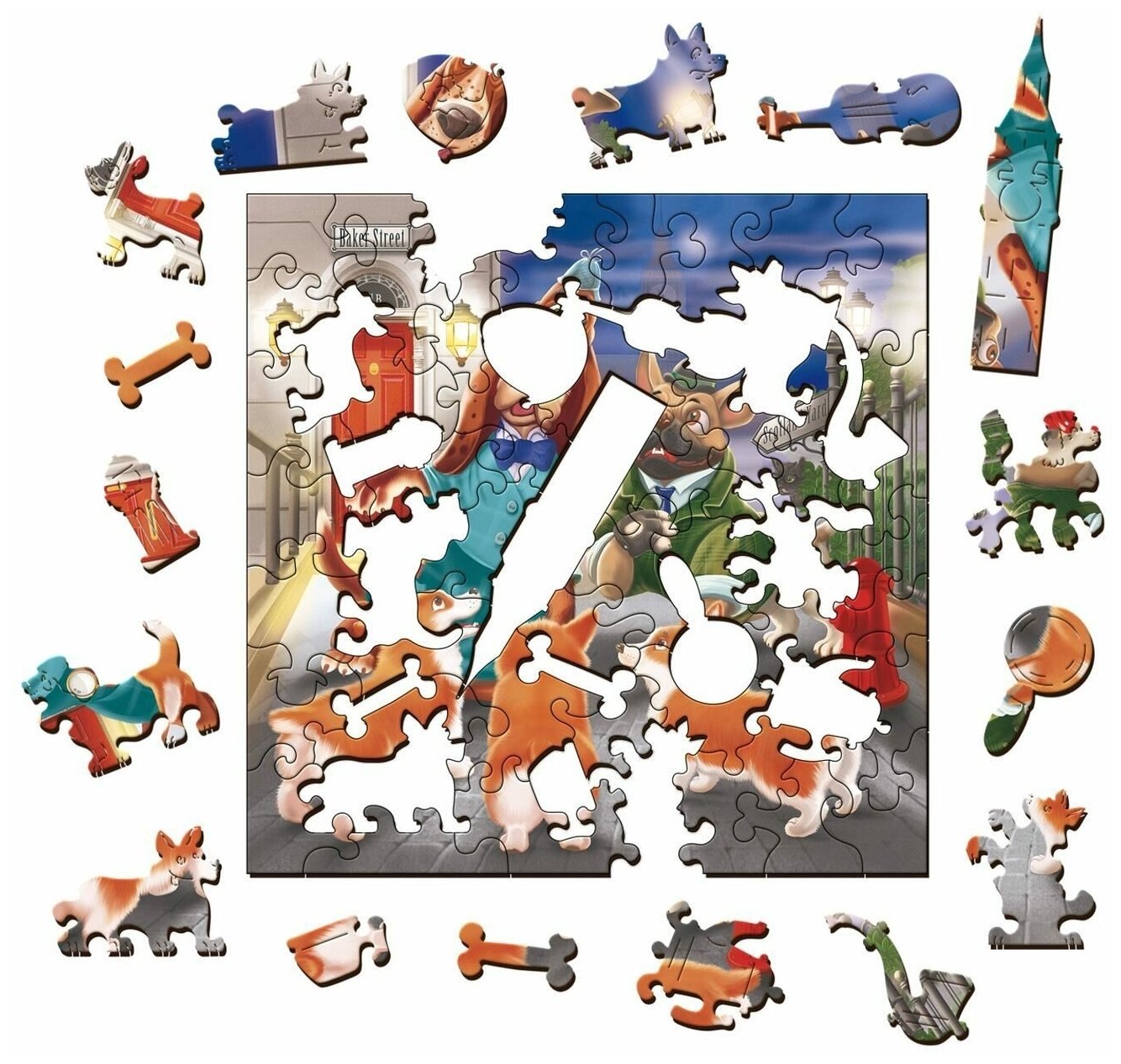 Фигурный пазл отличается от стандартного необычной формой деталей. Кроме того, часть деталей выполнены в форме предметов, связанных с тематикой картинки. В данном случае это: собачки, трубка, скрипка, лупа, Биг Бен ... Детали пазла выполнены из фанеры. Рисунок нанесен прямо на дерево с помощью специального принтера, он долговечен и не сотрется даже после многократных сборок. Такой пазл понравится и детям и взрослым, ведь сборка доставляет визуальное и тактильное удовольствие.