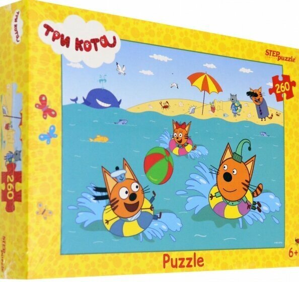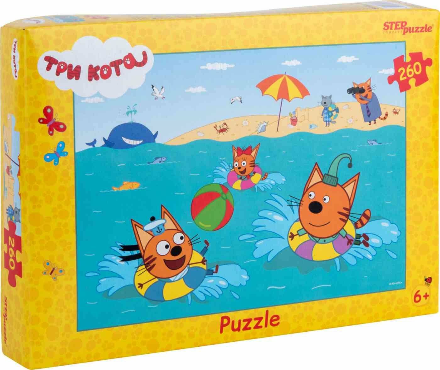 Пазл «Три кота» состоит из 260 деталей и основан на историях из любимого детского мультфильма. На этот раз Коржик, Карамелька и Компот отправились купаться в море. Они играют в мяч, а на берегу их ждут папа и друг Нудик.