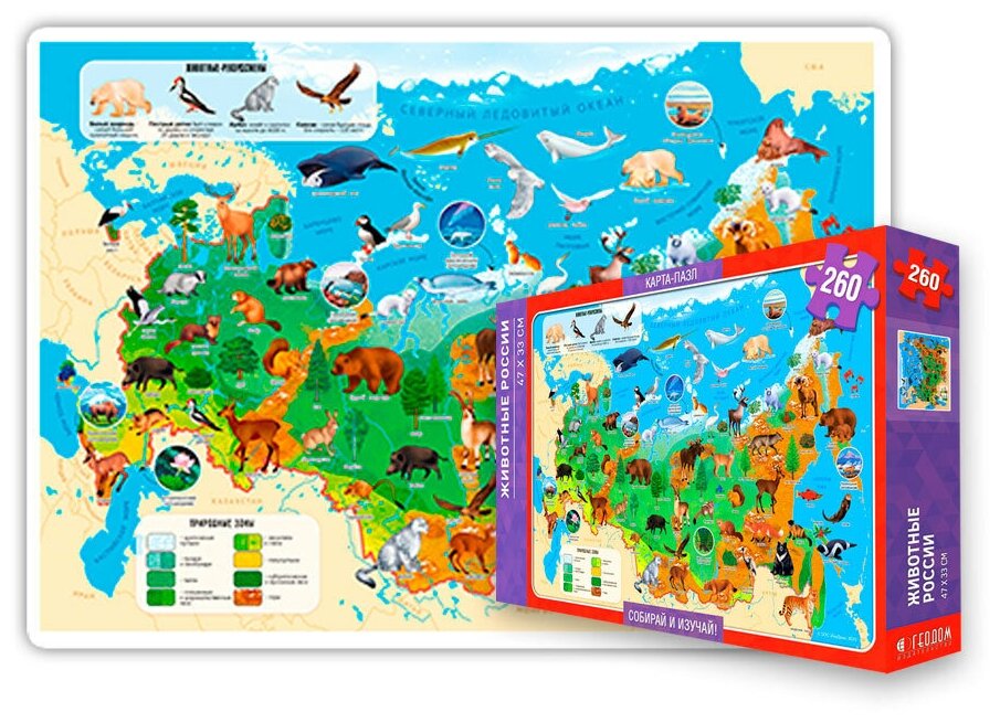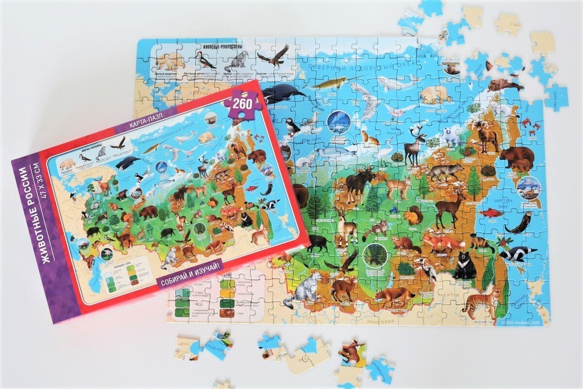 Карта-пазл «Животные России» позволяет в процессе интересной игры легко изучить и познать окружающий мир растений и животных нашей родины! Ваш ребенок в процессе игры с большим интересом изучит флору и фауну в различных частях России, а также обитателей океанов и морей. Играя, ребенок развивает воображение, пространственное мышление, внимание и память! Познавайте окружающий мир вместе с ребенком, собирая данную карту-пазл!