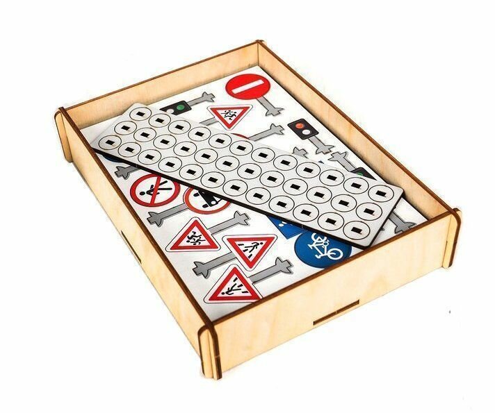 В комплекте: деревянный ящик для хранения, детали для конструирования дорог, комплект фигурок, подставки для фигурок, рекомендации по использованию со схемами дорожных ситуаций.