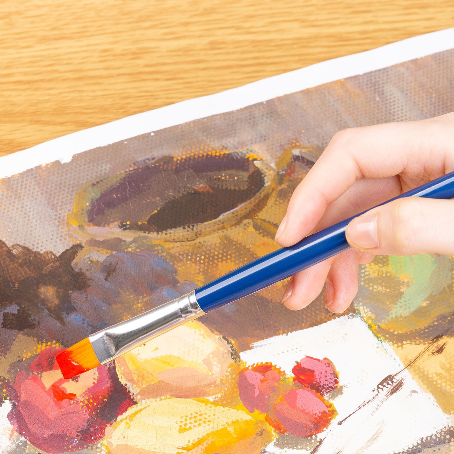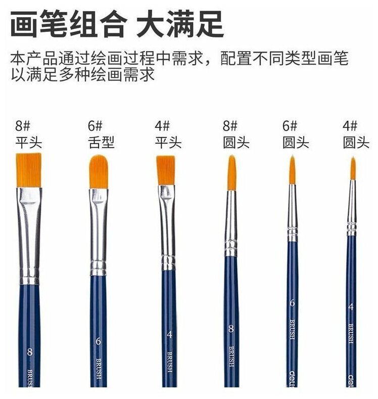 Кисти из синтетического материала (нейлона) от производителя канцтоваров. Ворс щетины имеет среднюю жесткость и подходит для масляных красок, акриловых, гуаши, акварели. В наборе 6 кистей: две плоские № 4 и 8 (подходят для раскрашивания большой площади), одна овальная № 6 (подходит для частичного окрашивания) и три круглые № 4, 6 и 8 (для прорисовки мелких деталей). Алюминиевый держатель щетины не царапает бумагу во время рисования. Ручки кистей деревянные темно-синего цвета.