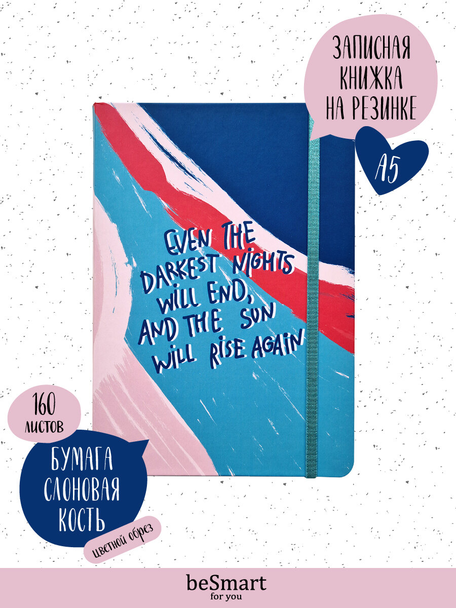 Ты задумывался о том, как важно говорить "да" своим желаниям? Хвалить себя за то, что получилось хорошо и не сдаваться, если получилось хуже, чем ты ожидаешь? В коллекции "Paints" от Be Smart мы решили отразить внутреннюю силу каждого человека. Ты свободен и можешь всё, что угодно, только поверь! И вдохновиться тебе поможет наша записная книжка А5 формата (140х200 мм), которая без труда уместится в рюкзак или сумку, чтобы в нужный момент сделать важные записи. Крепкое ниткошвейное скрепление очень долговечно, значит записная книжка прекрасно прослужит все время использования.Обложка из твердого переплетного картона и мелованной бумаги с цветной печатью имеет приятную ламинацию, защищающую от загрязнений и повреждений, и имеет скругленные уголки, которые не повредят подкладку сумки. А плотная контрастная вертикальная резинка не позволит растрепаться страницам и сохранит первозданный вид изделия на долгое время. Внутренний блок в линейку со скругленными уголками на 160 листов (320 страниц) из высококачественной, приятной для глаз бумаги цвета слоновой кости плотностью 70 г/м2 имеет полезные информационные страницы и окрашенный обрез, что делает записную книжку оригинальнее. А удобная широкая атласная закладка поможет быстро открыть нужный разворот.