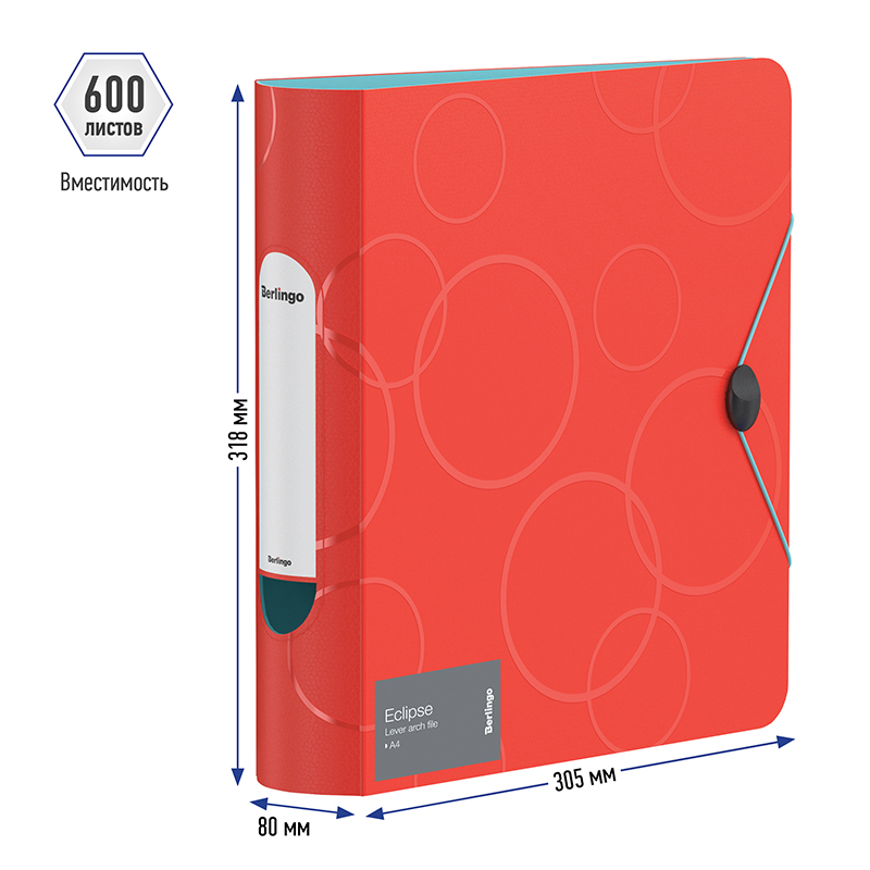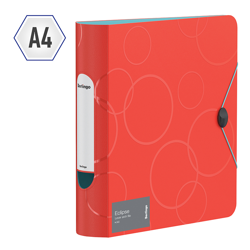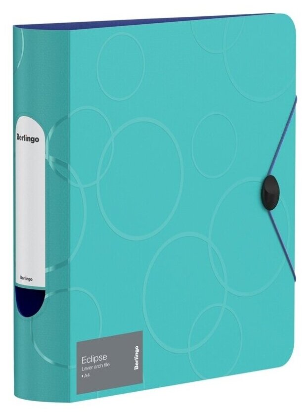 Стильная папка-регистратор Berlingo "Eclipse", с круглым корешком, с увеличенной толщиной обложки, для документов формата А4. Материал - полифом, толщина 2500 мкм. Насыщенный бирюзовый цвет внешней стороны в сочетании с изящной фактурой в виде глянцевых пересекающихся окружностей. Контрастный яркий синий цвет внутренней поверхности. Надежный металлический хромированный механизм. Механизм фиксации папки в сложенном виде с помощью цветных резинок и стильной пластиковой застежки черного цвета. Специальная наклейка на корешке, позволяющая делать пометки о содержимом + дополнительная наклейка в комплекте. Эргономичная полукруглая вырубка в корешке для быстрого извлечения папки из хранилища. На внутренней стороне обложки оснащена плотным прозрачным карманом для удобного хранения мелочей: ручки, заметок, визиток, дисков, флешек и др. Папка вмещает до 600 листов.