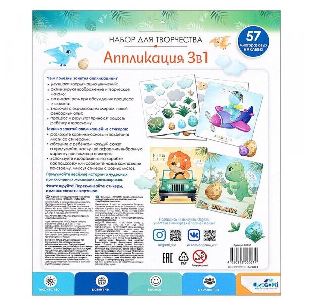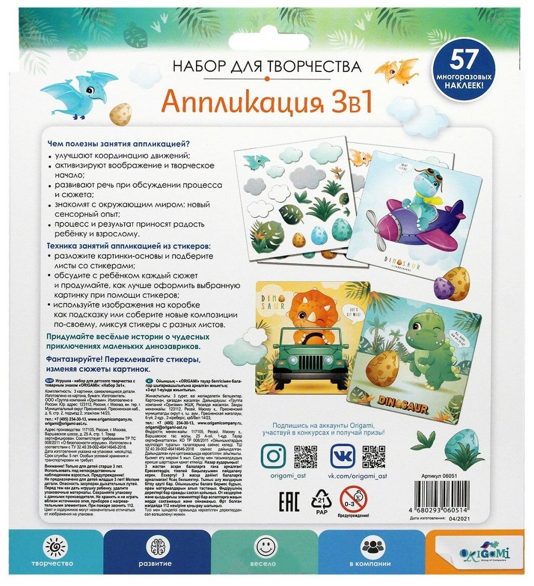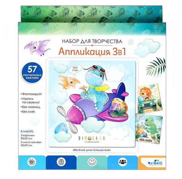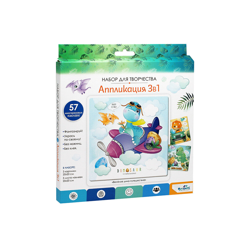 Набор аппликаций 3в1 "Веселое дино путешествие" - это полезный и интересный досуг для детей и их родителей. Занятия аппликацией успокаивают, улучшают координацию движений, активизируют воображение и креативные навыки. Такой вид творчества полезен и детям, и взрослым, а еще абсолютно безопасен, т.к. не требует использования клея и ножниц. Яркие картины станут отличным украшением вашего интерьера и подарят радостные эмоции всем близким!