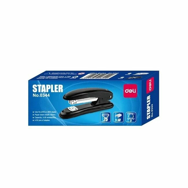 Степлер Deli E0322 24/6 26/6 до 25 л металл оборудован надежным металлическим механизмом на 50 скоб с индикатором окончания скоб, который скрепляет до 25 листов бумаги стандартной плотности креплением открытого и закрытого типа.
