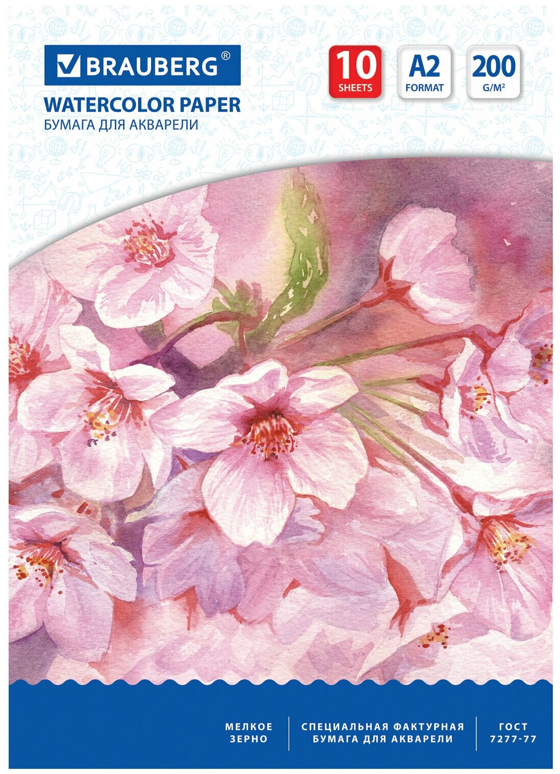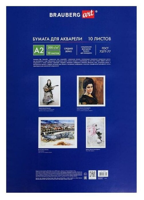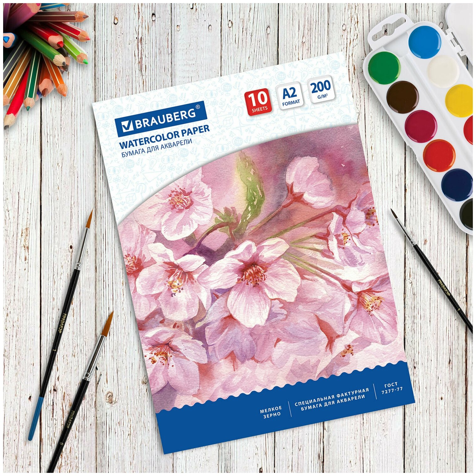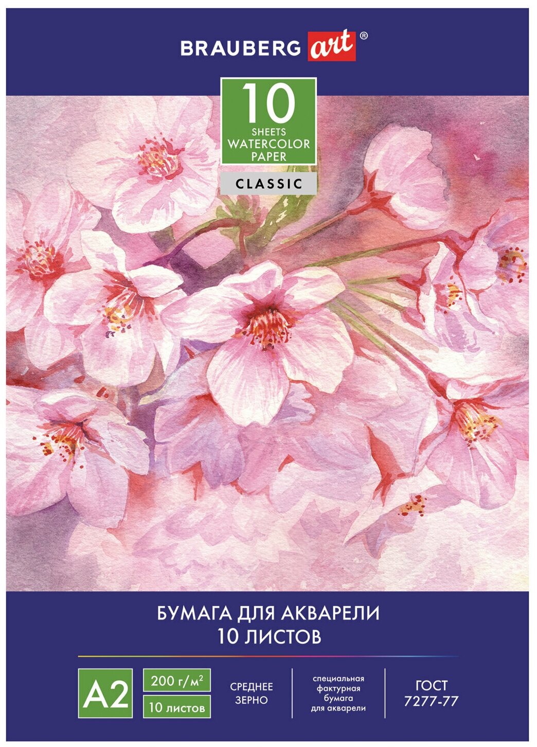 Папка для акварели BRAUBERG содержит 10 листов формата А2 (400?590 мм), специально предназначенных для рисования всеми видами водорастворимых красок. Качественные листы высокой плотности 200 г/м2 устойчивы к истиранию, воздействию влаги, обеспечивают чистую реалистичную передачу цвета. Акварельная бумага изготовлена по ГОСТ 7277-77. Белизна 100%. Текстура бумаги «среднее зерно» подходит для разных техник рисования: как для детализированной живописи, так и для создания красивых зернистых эффектов. Обложка выполнена из мелованного картона.