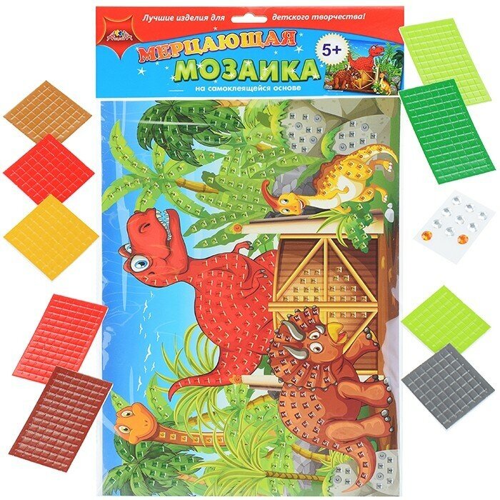 Набор для детского творчества "Мерцающая мозаика" понравится детям от 5-ти лет. На цветной картонной основе числами и цветом показаны места куда необходимо приклеить элементы мозаики. Элементы имеют клеевой слой, поэтому вы обойдетесь без клея и ножниц. В результате получится яркая картинка, которую отлично дополнят глазки и стразы. Набор включает цветную картонную основу размером 25,5 х 35 см, самоклеящиеся цветные элементы мозаики, глазки и стразы. Занятия с помощью этого набора развивают мелкую моторику, внимание, аккуратность. Все необходимые детали для поделки входят в состав набора.