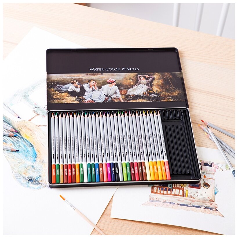 36 цветных акварельных карандашей в лаконичном корпусе. При контакте с водой штрихи карандаша теряют четкость линий, превращаясь в яркий оттенок.