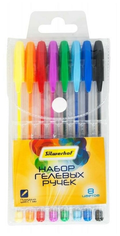 Набор гелевых ручек Silwerhof включает в себя 8 ярких цветов. Ручки имеют прозрачный круглый корпус из пластика, благодаря чему хорошо видны яркие чернила, а клип на колпачке соответствует цвету чернил. Диаметр пишущего узла - 1 мм, что оптимально для письма, рисования и даже для раскрашивания. С такими инструментами заняться творчеством захотят и дети, и взрослые. Набор упакован в пластиковый пенал-блистер с кнопкой, благодаря чему их удобно хранить и брать с собой в школу, поездки и путешествия!