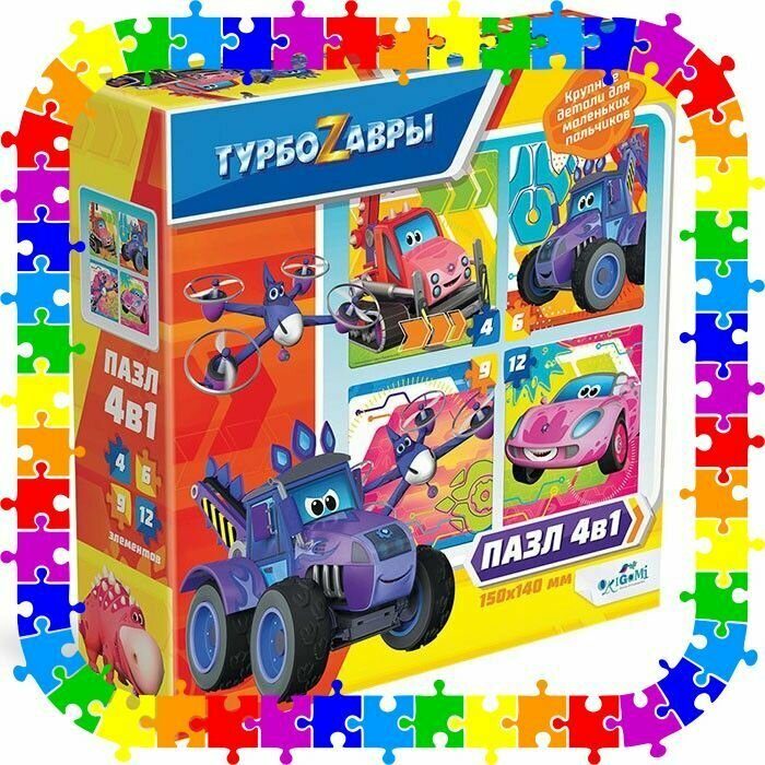 Набор пазлов 4в1 - это комплект пазлов с разной элементностью, включающий в себя головоломки из 4, 6, 9, 12 элементов, объединенных общей тематикой. Это необычная коллекция картинок с изображением любимых персонажей серии Турбозавры, которая понравится любому ребенку. Соберите всю коллекцию и окунитесь в новое приключение вместе с известными героями. Постепенно усложняя сборку пазла от 9 элементов до 36 элементов, ребенок научится внимательности, концентрации, а также сможет развить мелкую моторику.