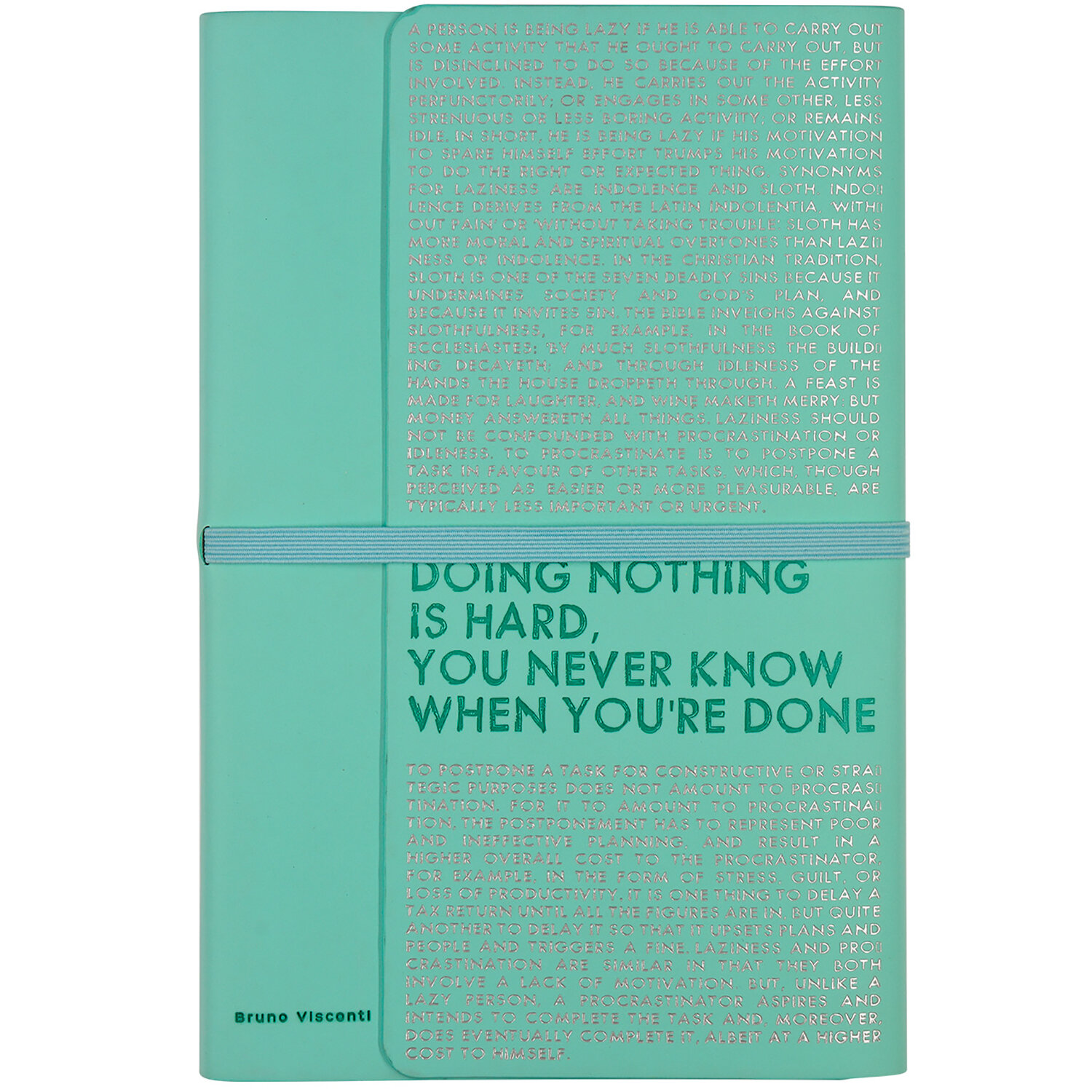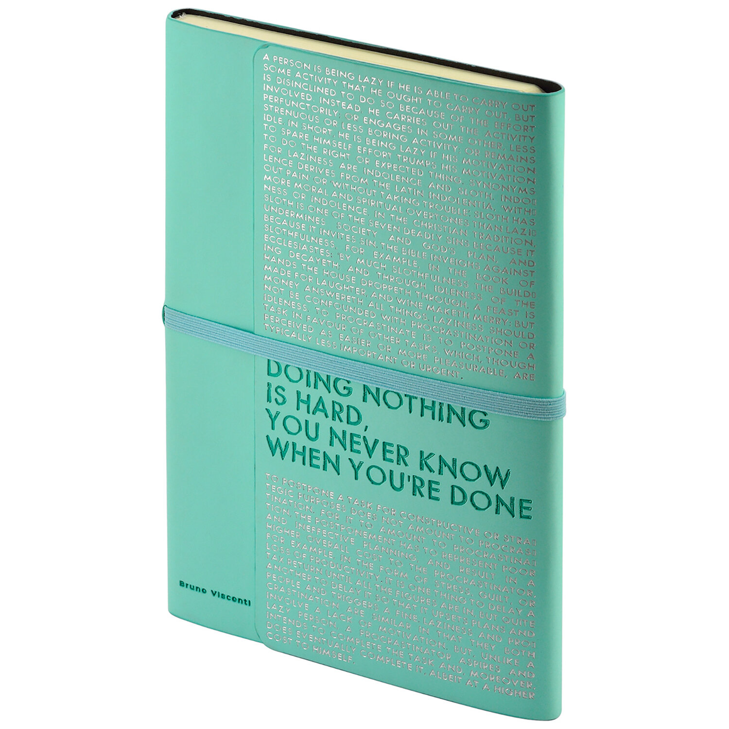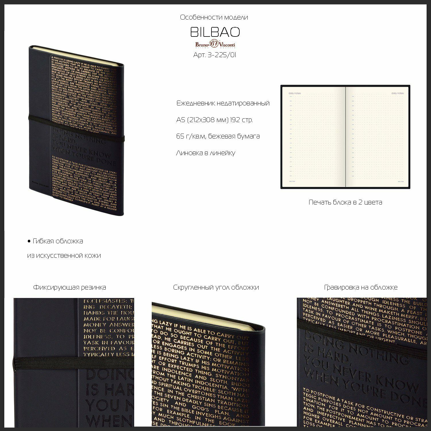 Так трудно ничего не делать, ведь совершенно непонятно, когда ты закончишь! Лаконичный слоган мотивирует к активным действиям. Планируй и завершай! Вот что кроется в элегантной надписи, выполненной золотым тиснением! Недатированный ежедневник «BILBAO» формата А5 с фиксирующей резинкой – отличный вариант для современного динамичного человека.Ежедневник безусловно привлекает к себе внимание оригинальным дизайном: гибкая (flex) обложка с очень мягким, бархатистым покрытием Soft touch и тиснением фольгой (часть обложки внахлест может использоваться как закладка), скругленные углы, предотвращающие замятие листов.Сам бумажный блок выполнен из высококачественной бежевой бумаги плотностью 65 г/кв. м, отпечатан в два цвета и содержит страницу для личных данных, страницы в точку с указанием времени (интервал в один час). Ежедневник упакован в картонный ложемент.