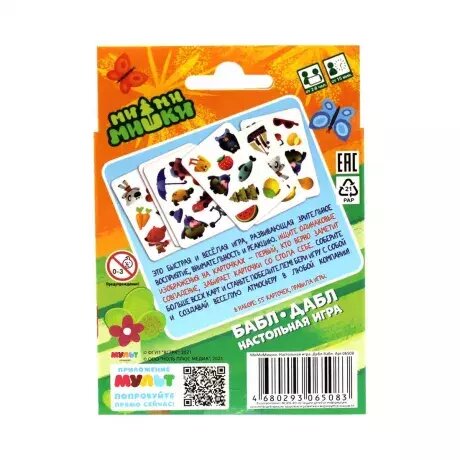 Дабл-бабл это игра на поиск и набор наибольшего количества одинаковых карт В норобке 55 карточек, выполненных в дизайне известной детской лицензии «МиМиМишки» – самого популярного проекта на телеканале «Карусель» по рейтингам телезрителей