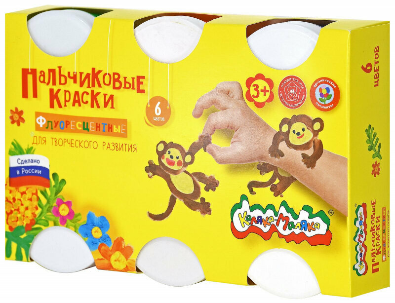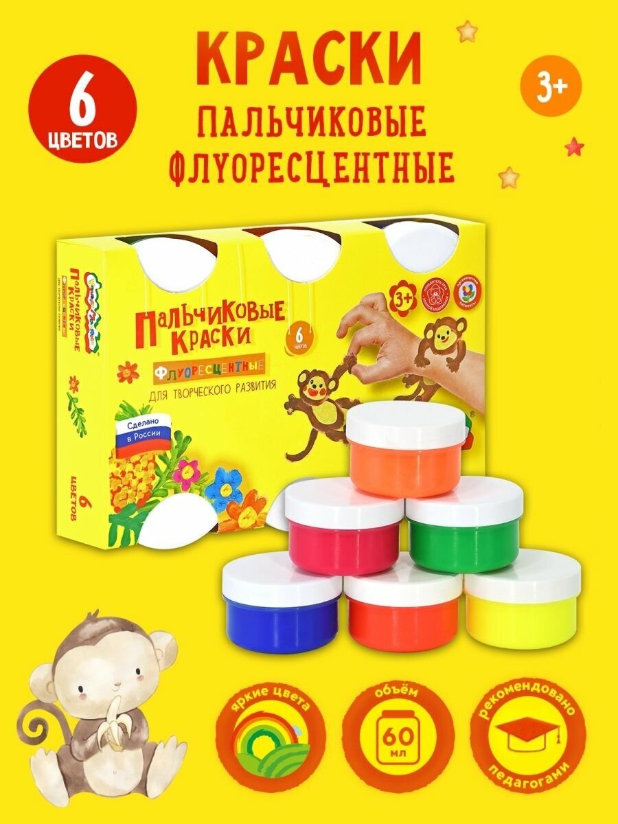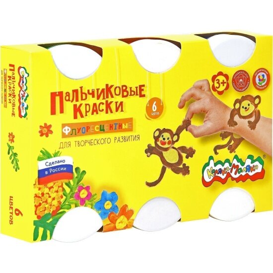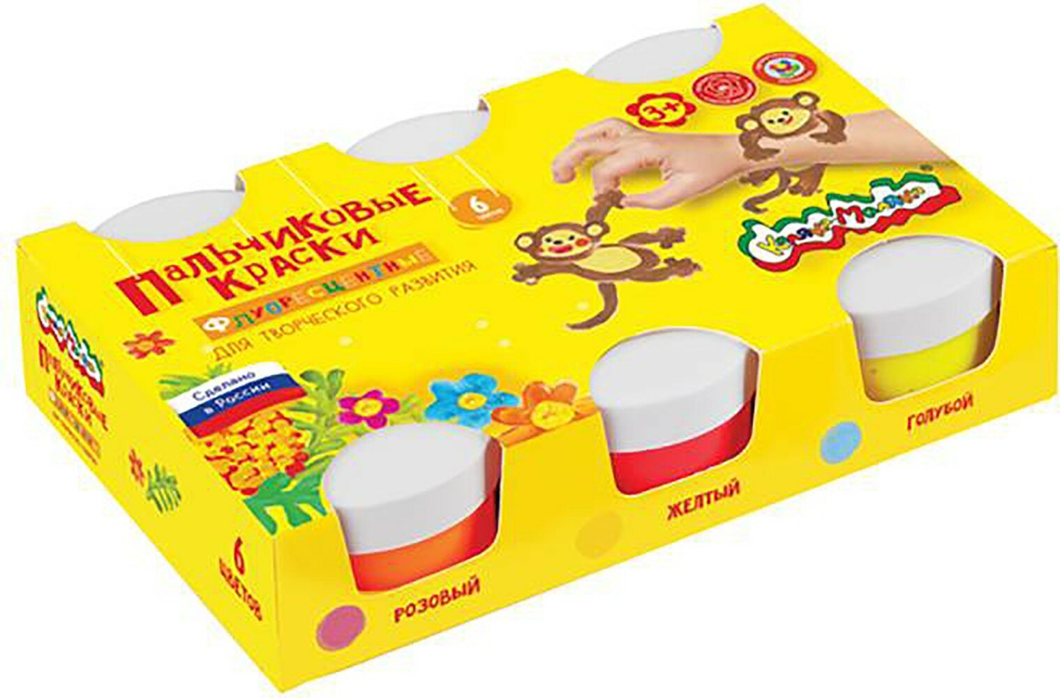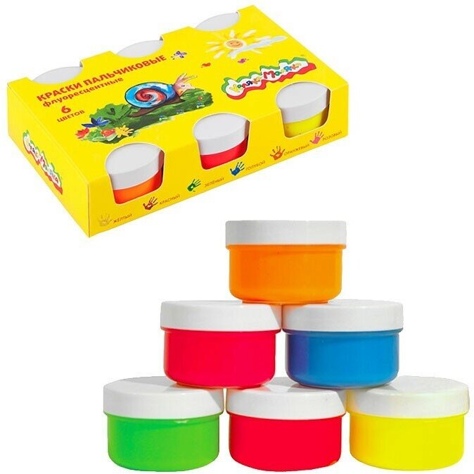 Краски пальчиковые флуоресцентные 6 цветов баночки 60 мл (ПФККМ6) Каляка-Маляка