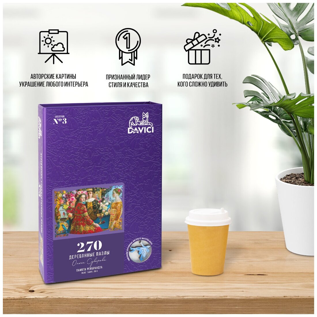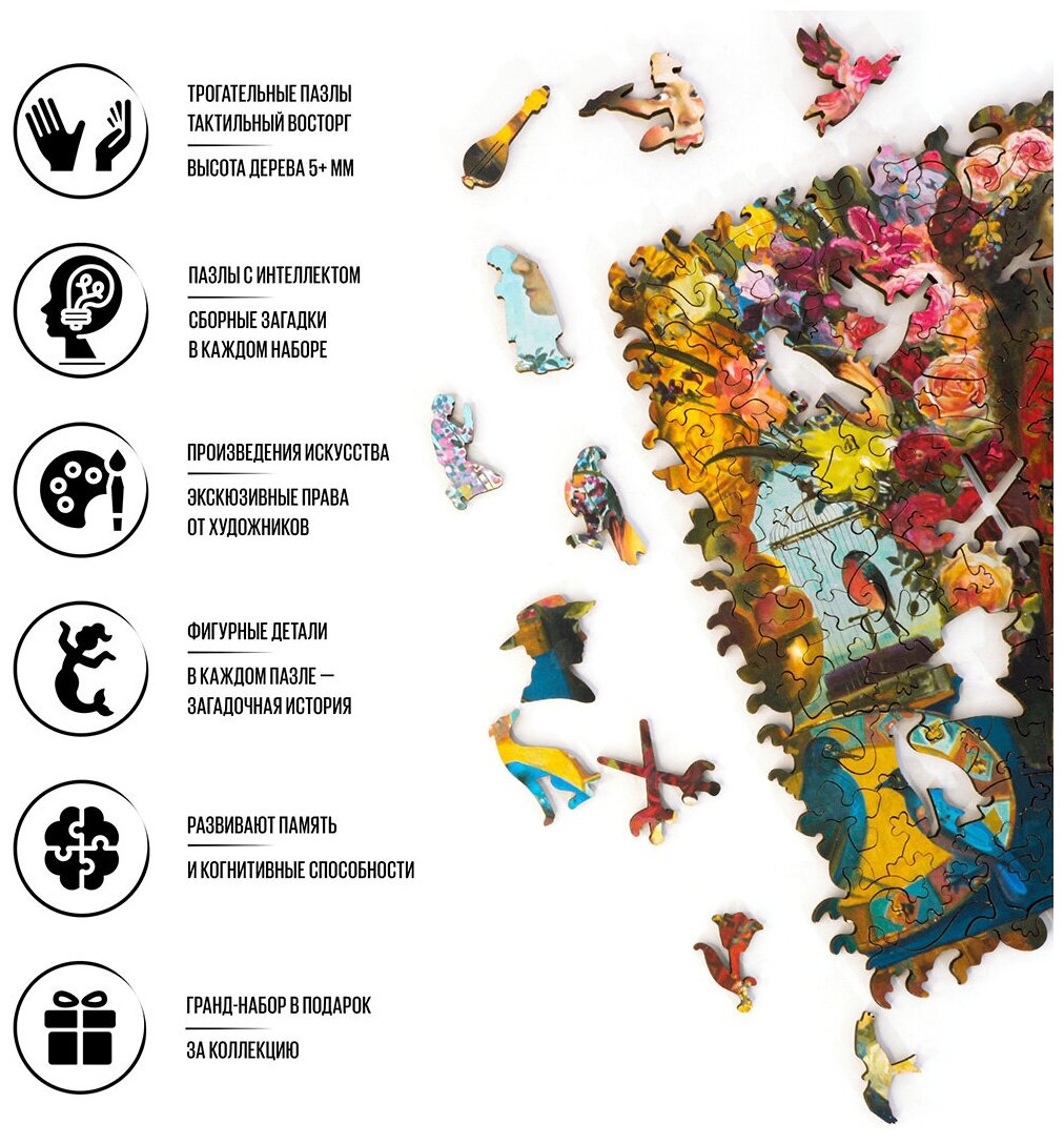 Пазлы DaVICI - это приключение вглубь ожившей картины. Коробка в ваших руках, словно книга, хранит в себе историю героев художественных произведений, сказок и сюрреалистических сюжетов, исполненных в узнаваемых деревянных деталях. Фигурки людей, птиц и зверей, королей и странников, звезд и планет оживают и сопровождают в свои удивительные уютные миры, где всегда ждут вас в гости. Картины художников, воплощенные в пазлах, предстают настоящими произведениями искусства. Приятный запах дерева заявит о реальности маленького мира в ваших руках. Вы почувствуете его сразу, открыв коробку. Тактильный восторг награждает вас с каждым щелчком соединения деталей. Погружение в миры DAVIGI вызывает детскую радость, дарит чистое удовольствие от процесса. Это как возрождение дорогих воспоминаний и пробуждение в себе того, что по-настоящему ценно.