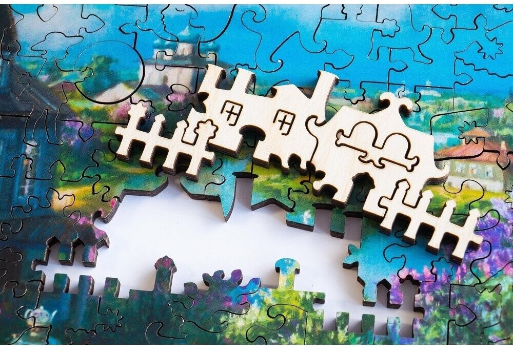 В деталях пазла - девичья жизнь в тихом домике среди сирени, где жить светло и просто. Очарование простоты предстает в близких образах детства и взросления, шалостей и мечтаний цветущей, безмятежной юности. Искусно вырезанные деревянные фигуры складываются в красивый и душевный пейзаж.