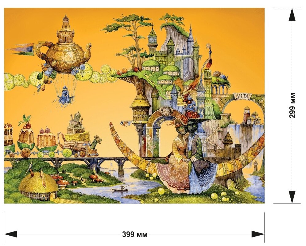 как сказал ребенок 6 лет, когда собирали этот пазл: "ну очень странный сон этому человеку приснился" - дракон с тортом и летающий чайник. обычно пазлы давичи это красивая цветная картина и интересные формы с обратной стороны, но цветная сторона этого набора заставляет задержаться и поразглядывать интересные мелочи изображенные в рисунке. например, когда смотрели на бумажную картину подумали какие странные хвосты, будто пришитые, у котов, и только в собранном виде поняли, что оказывается это кошки сидят на месяце. и кстати, этот набор действительно сложный в сборке, плюс содержит много составных фигур - тут и мост и целый замок!