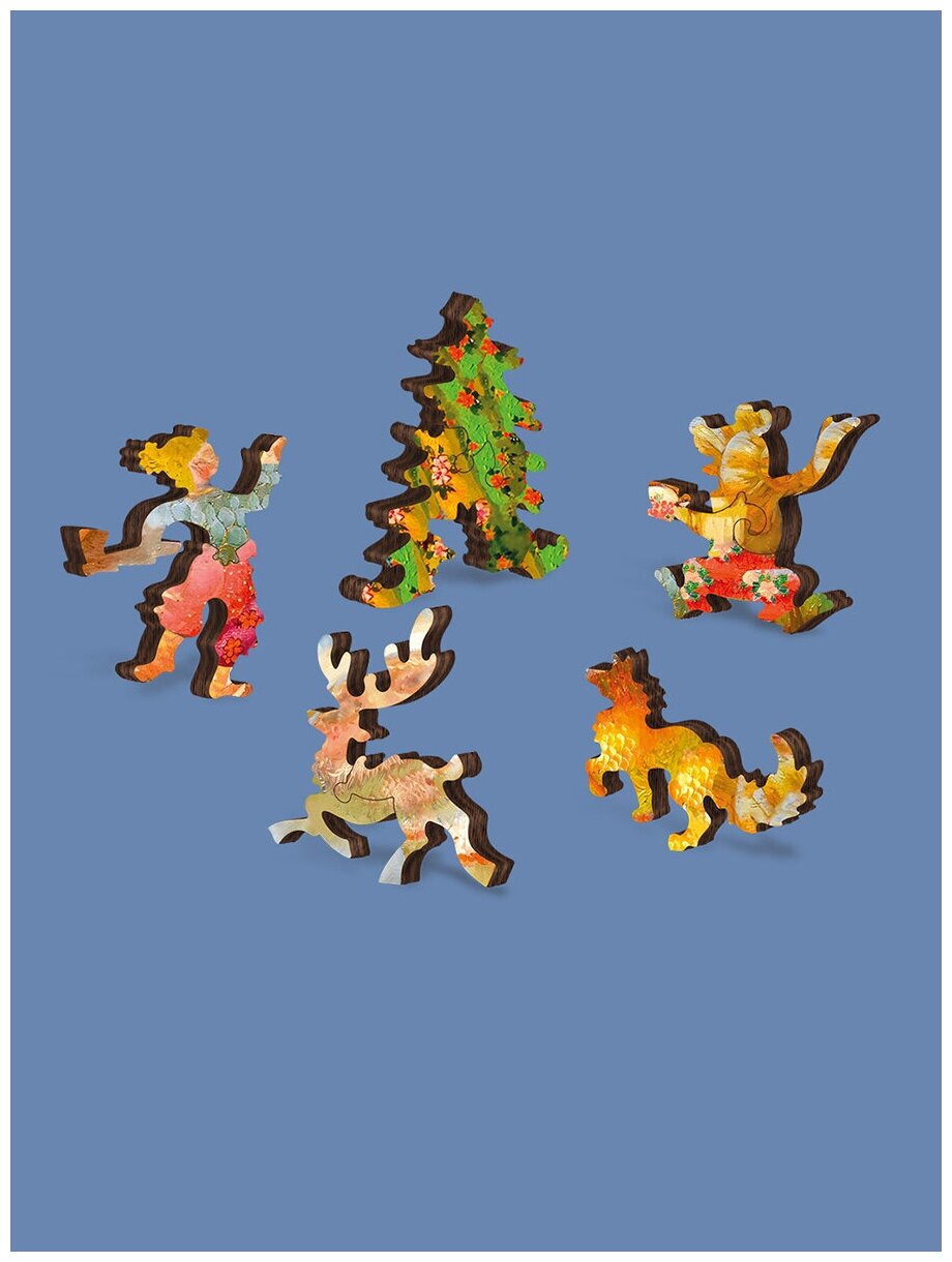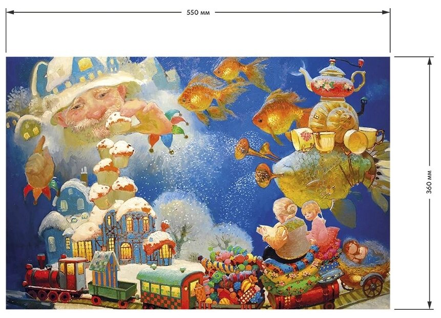 "Чух-чух-чух!" - сквозь снежные просторы мчится сказочный поезд с самым важным новогодним багажом: игрушками и угощением для тех, кто целый год ждал чуда. Светятся оконца поезда, волшебные игрушечные обитатели предвкушают встречу с новым домом, и сказка ближе с каждым мгновением. А если приглядеться к кружеву пазла, можно увидеть, как главный новогодний волшебник мчится в оленьей упряжке по узорчатым ледяным рельсам, спеша раздать подарки.