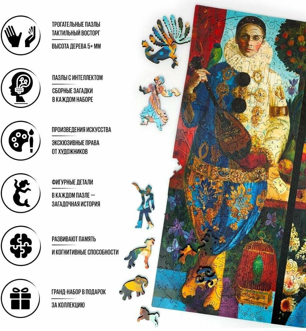 3 картины в одной. Одна из главных изюминок набора заключается в том, что каждая из трех частей триптиха создана в своем уникальном стиле. Стилизованные детали - как подсказки, помогают в сборке. Атмосфера этого набора - как слаженный ансамбль, где каждая из частей триптиха звучит особой музыкой. Это Набор-трилогия о жизни при дворе в галантный XVIII век, в "столетие париков, карет и менуэтов", раскрывает истории трех героев - фрейлины, пажа и придворного музыканта, наполненные праздностью, великолепной музыкой и изысками двора. По-французски утонченный, стиль рококо придает набору особенную декоративность: детали образуют орнаменты-рокайли, подобные украшениям из раковин. Необыкновенная светопись, нежнейшие цветовые переливы и пастельные тона словно дышат вечной молодостью и красотой