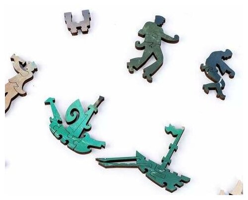 Разглядывая детали набора, словно оказываешься на борту корабля: здесь штурвал и якорь, компас и песочные часы, глобус, керосиновая лампа, колокол… Рез пазла насыщен морскими обитателями: причудливые рыбки среди водорослей и кораллов, краб и черепаха, кальмар и осьминог, креветка, морские коньки и звезды, раковина и большие сборные рыбы (одна из них - акула!) Самые внимательные найдут русалку и бутылку с посланием.