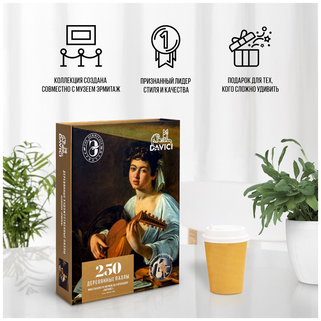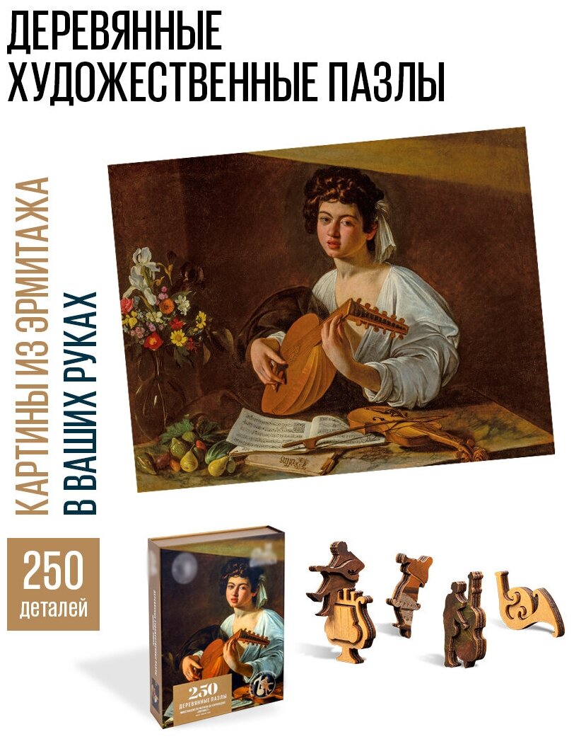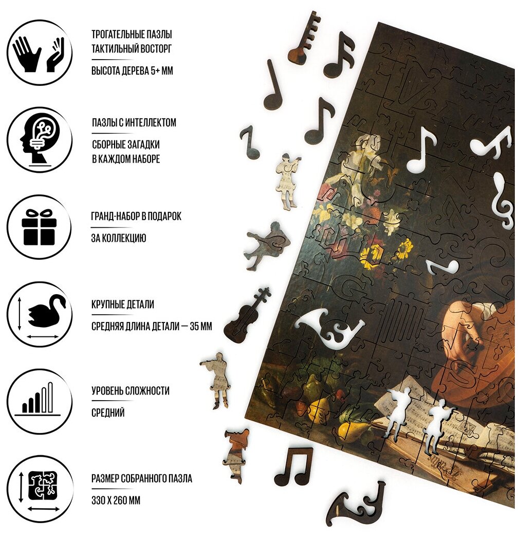 Самый музыкальный набор DaVICI. Целый оркестр в 22 деталях! Фигуры музыкантов эпохи барокко, нотные знаки и музыкальные инструменты от лютни до валторны. Как и картина Караваджо, наполненная тайными смыслами, рез пазла хранит несколько загадок.