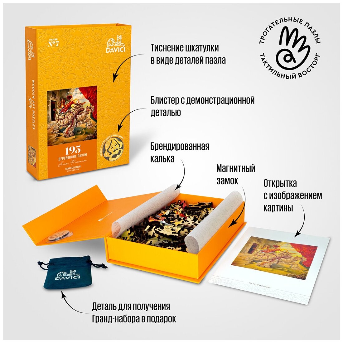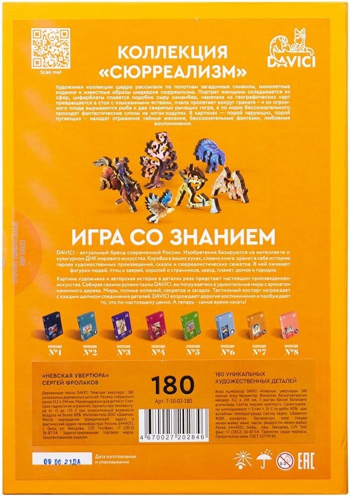 Вот такие пазлы я очень люблю. Замечательный, художник, который разрабатывал нарезку воплотил гениальные решения. Сюжет нарезки пазла удачно совместил классику, историю Питера и юмор. Персонажи вызвали улыбку. На мой взгляд, команда Давичи выпустила маленький шедевр. Не смотря на то, что такую тематику пазлов не очень люблю, сборкой просто наслаждалась.Учитывая не большое количество деталей сборка не простая.Прекрасным решением было оформить фигурный край. В целом пазл замечательный, рекомендую. Пока собирала, очень захотелось в Питер)).