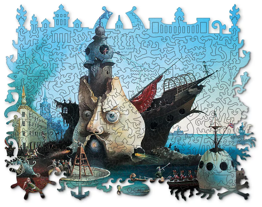 Вход в потусторонние миры открывается в Санкт-Петербурге, среди узнаваемых фигур - крылатых львов, сфинксов, фонарей Летнего сада. Вокруг - огнедышащие рыбы, затонувшие корабли, скрюченные человечки, готовая к бою пушка. А в центре реза разворачивается главное событие - жуткое сражение Кинг-Конга и Годзиллы! Венчают пазл Ростральные колонны, Исаакиевский собор, разводные мосты, входная арка и купола Казанского собора. Детали соединяют оригинальные зацепы в виде флагов и флажочков разных форм.