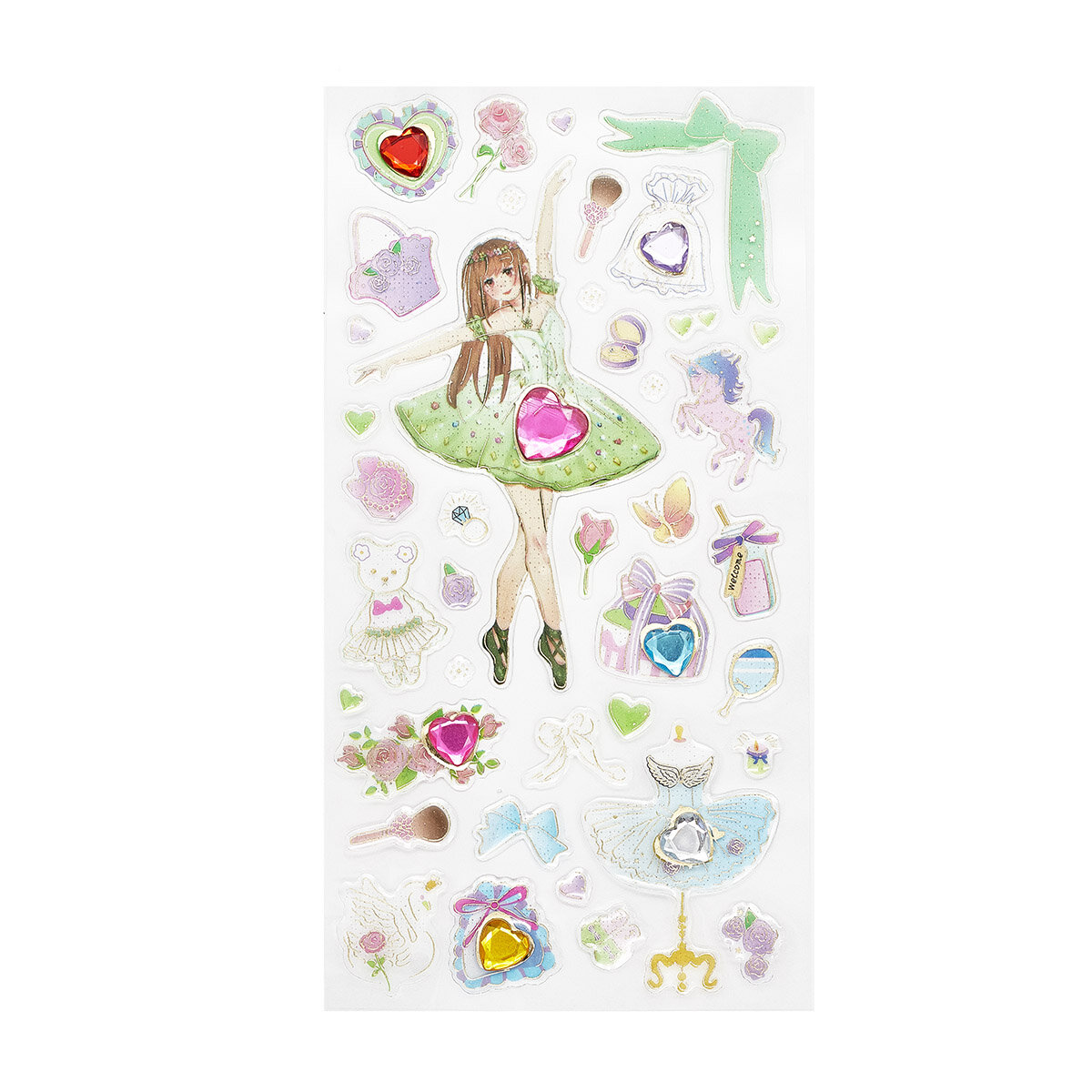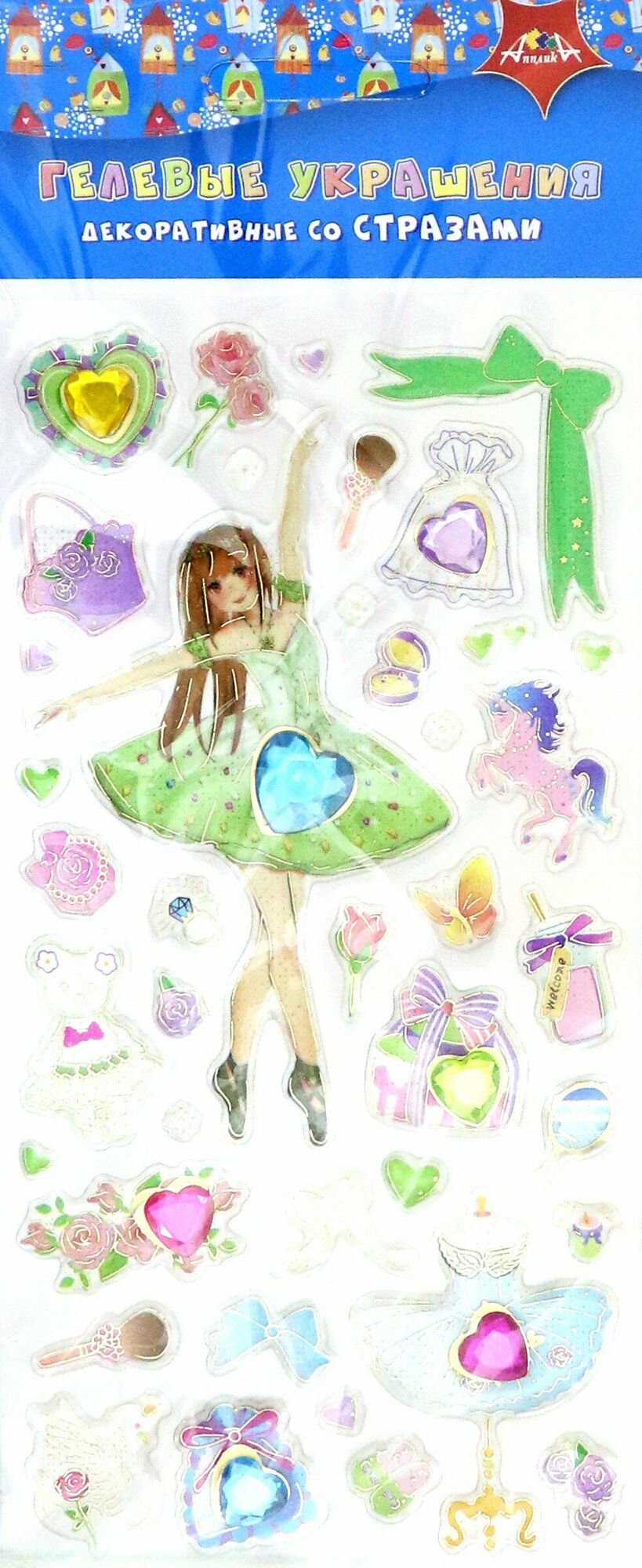 Материал для творчества. Декоративные гелевые украшения со стразами. Состав набора - объемные гелевые наклейки: фигурка девочки, цветочки, сердечки, бабочки, и другие элементы, а также акриловые стразы в форме сердечка. Все элементы имеют клеевой слой. Упаковка - ПЭТ пакет с картонным вкладышем и европодвесом.