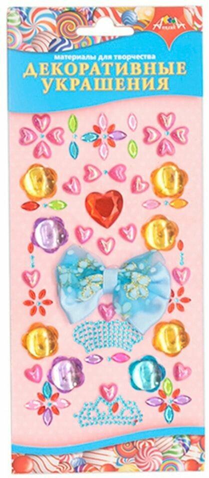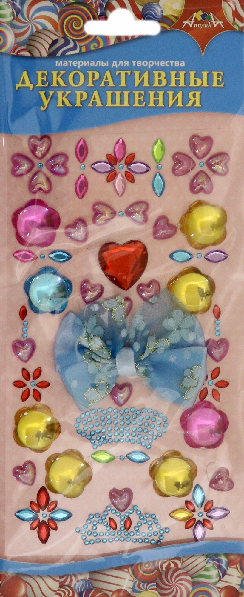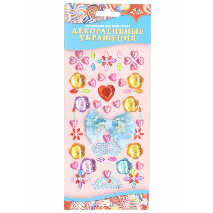 Набор для творчества. "Декоративные украшения самоклеящиеся". 2 варианта состава набора: 1 крупный бант с глиттерным узором, акриловые стразы разной формы и размеров, 2 зайчик из искусственного меха и дополнен цветочками и жемчужинками. Все элементы имеют клеевой слой. Упаковка - ПЭТ пакет с картонным вкладышем и европопдвесом.