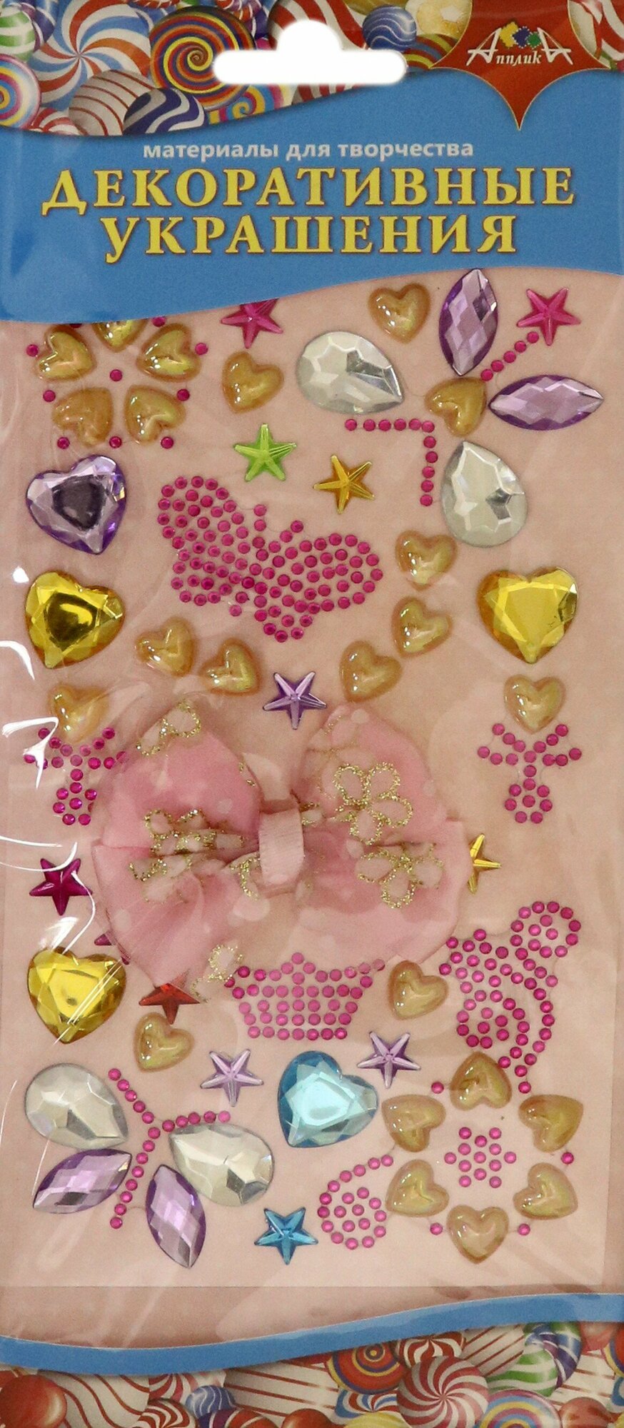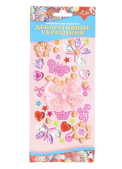 Набор для творчества. "Декоративные украшения самоклеящиеся". 2 варианта состава набора: 1 крупный бант с глиттерным узором, акриловые стразы разной формы и размеров, 2 зайчик из искусственного меха и дополнен цветочками и жемчужинками. Все элементы имеют клеевой слой. Упаковка - ПЭТ пакет с картонным вкладышем и европопдвесом.