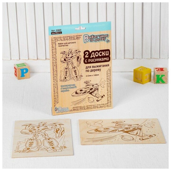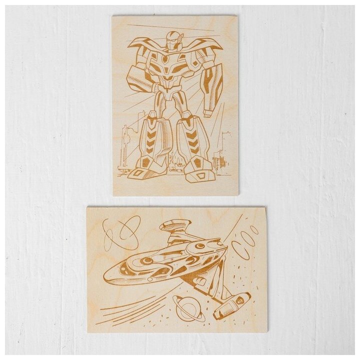 В состав набора входят 2 доски для выжигания с рисунками трансформера и космического корабля.