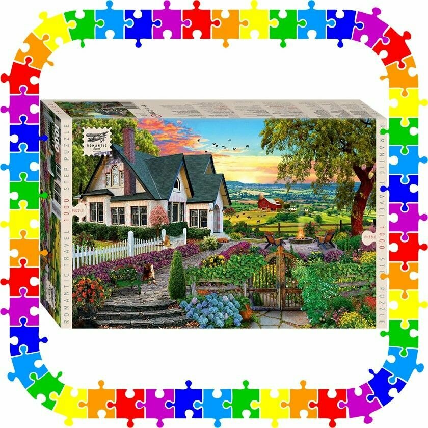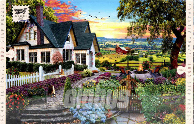 Пазл «Вид с вершины холма» входит в серию «Romantic Travel». Хилтоп можно смело отнести к одному из самых маленьких городов не только в США, но и в мире: его население не превышает и тысячи человек. Возможно, именно поэтому, глядя на картину в 1000 элементов, ощущается спокойствие, свойственное немногим городам. На вершине холма расположился уютный домик, вокруг которого разнообразные цветы и деревья. Идиллию не нарушает даже игривый котёнок, который так и хочет словить в свои лапы пролетающую мимо птицу. На фоне заката мы видим спящую собаку и стадо коров, которое пасётся на поле вблизи амбара.