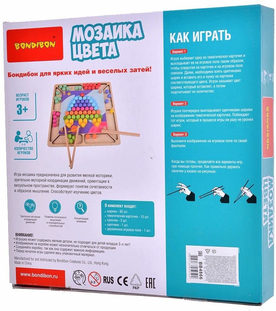 Деревянная развивающая настольная игра "МОЗАИКА ЦВЕТА" от Bondibon научит различать и комбинировать цвета, поможет в развитии мелкой моторики, координации движений, пространственного и творческого мышления, базовых навыков счета.